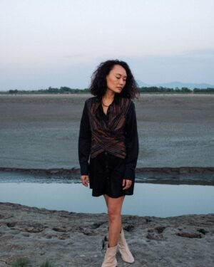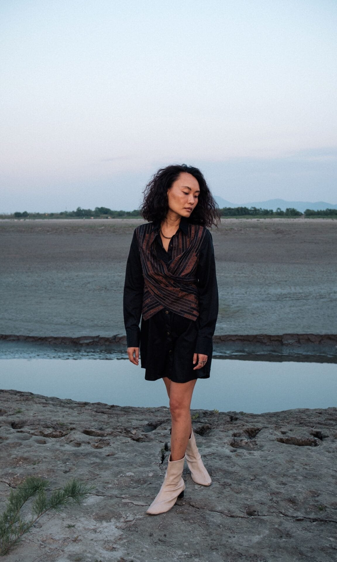 A truly exquisite wrap shirt short dress that seamlessly transforms from a sophisticated staple to a casually chic garment designed from upcycled fabric, made using post production waste.