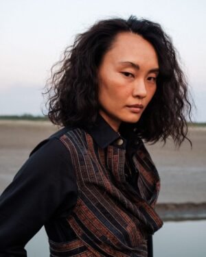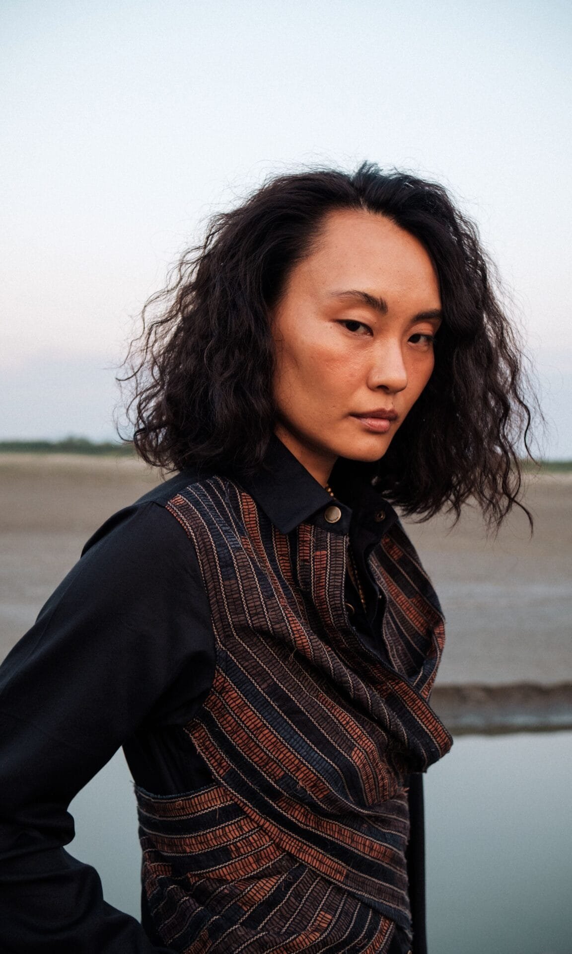 The garment is made from hand woven upcycled fabric and so the color might vary slightly for each batch.