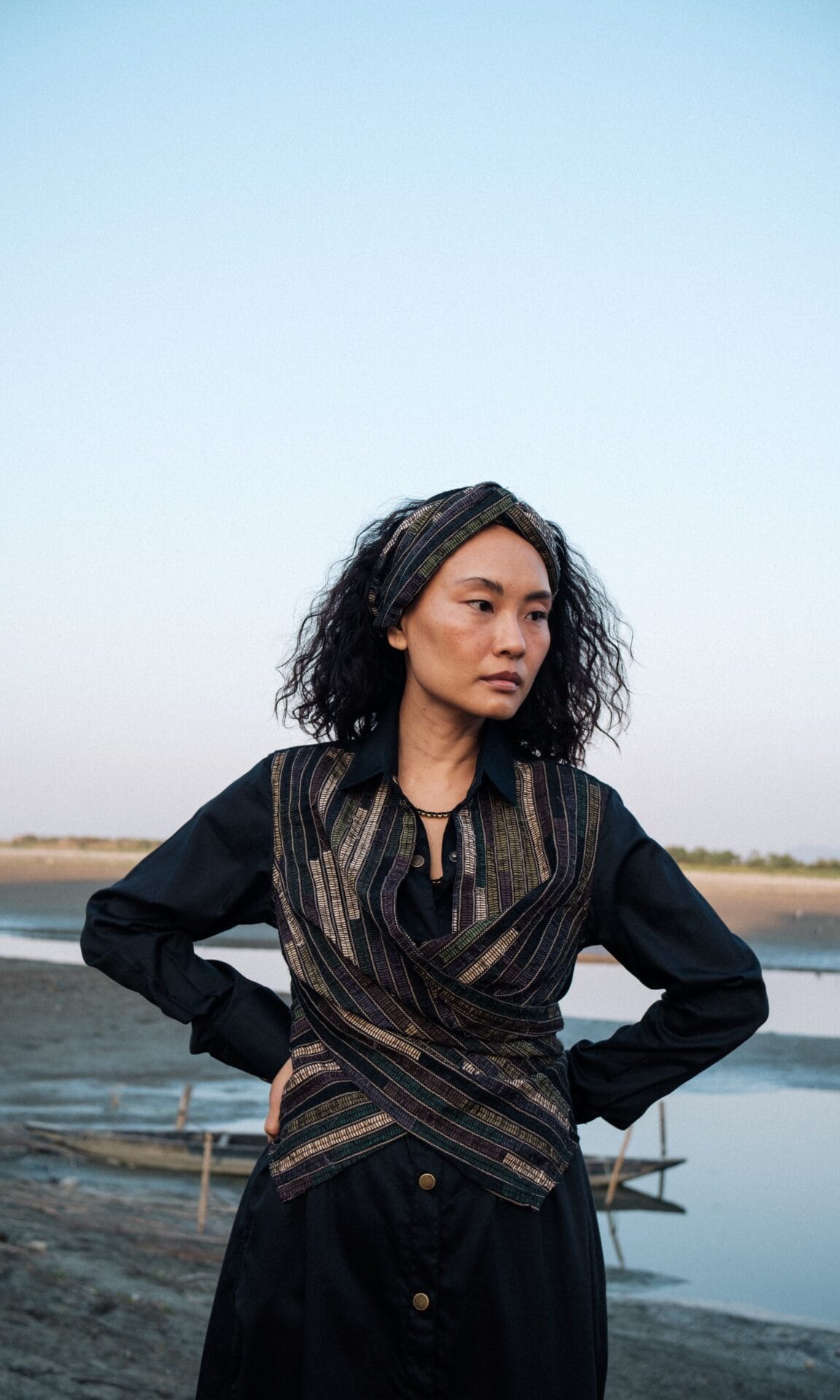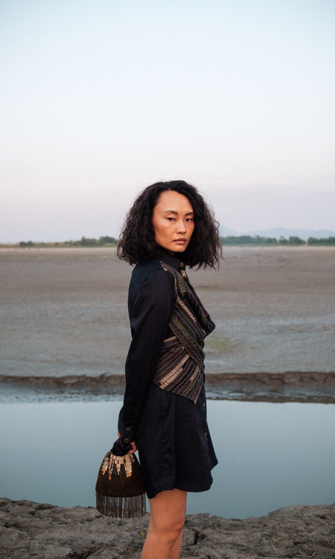 The garment is made from hand woven upcycled fabric and so the color might vary slightly for each batch.