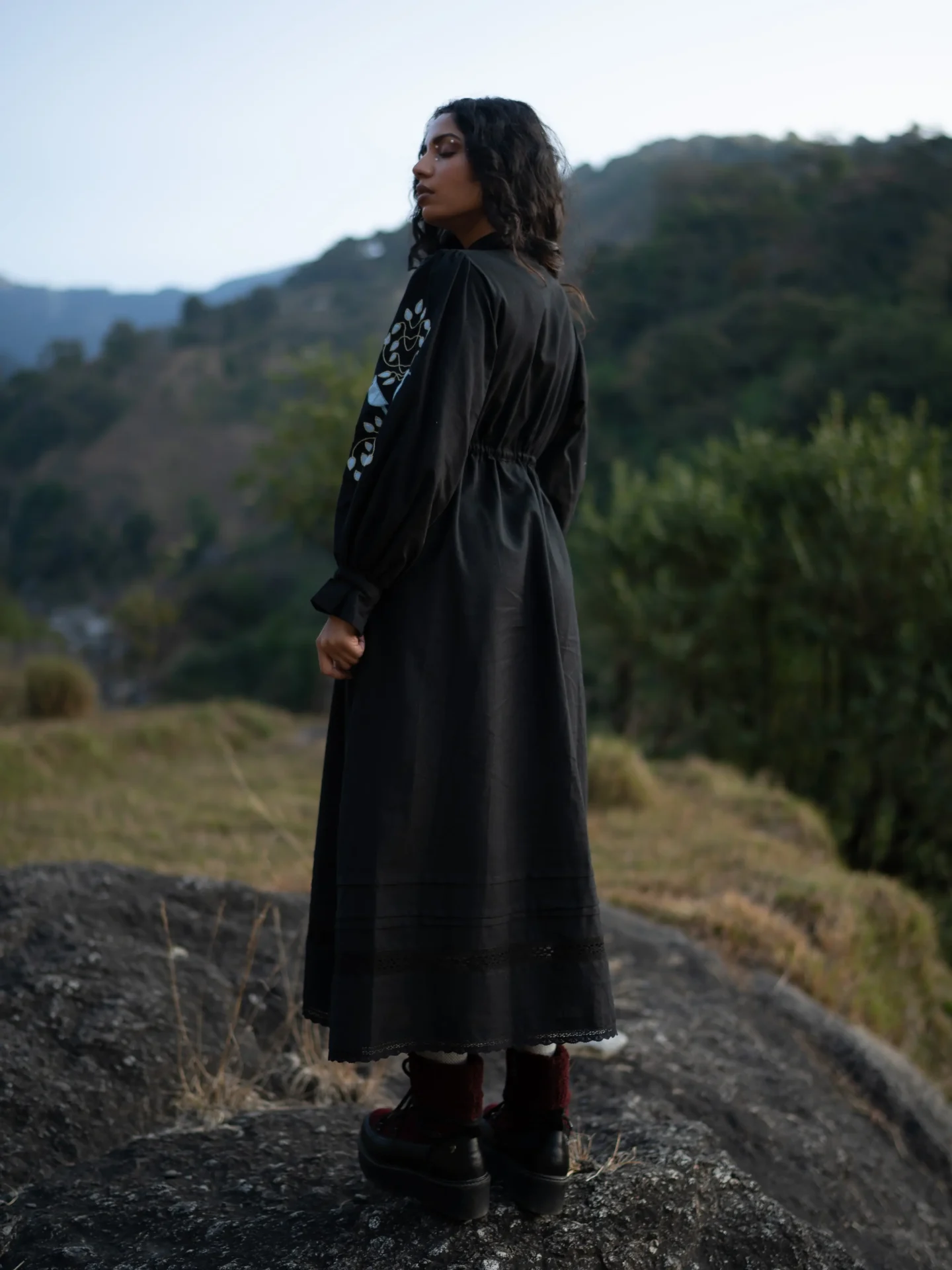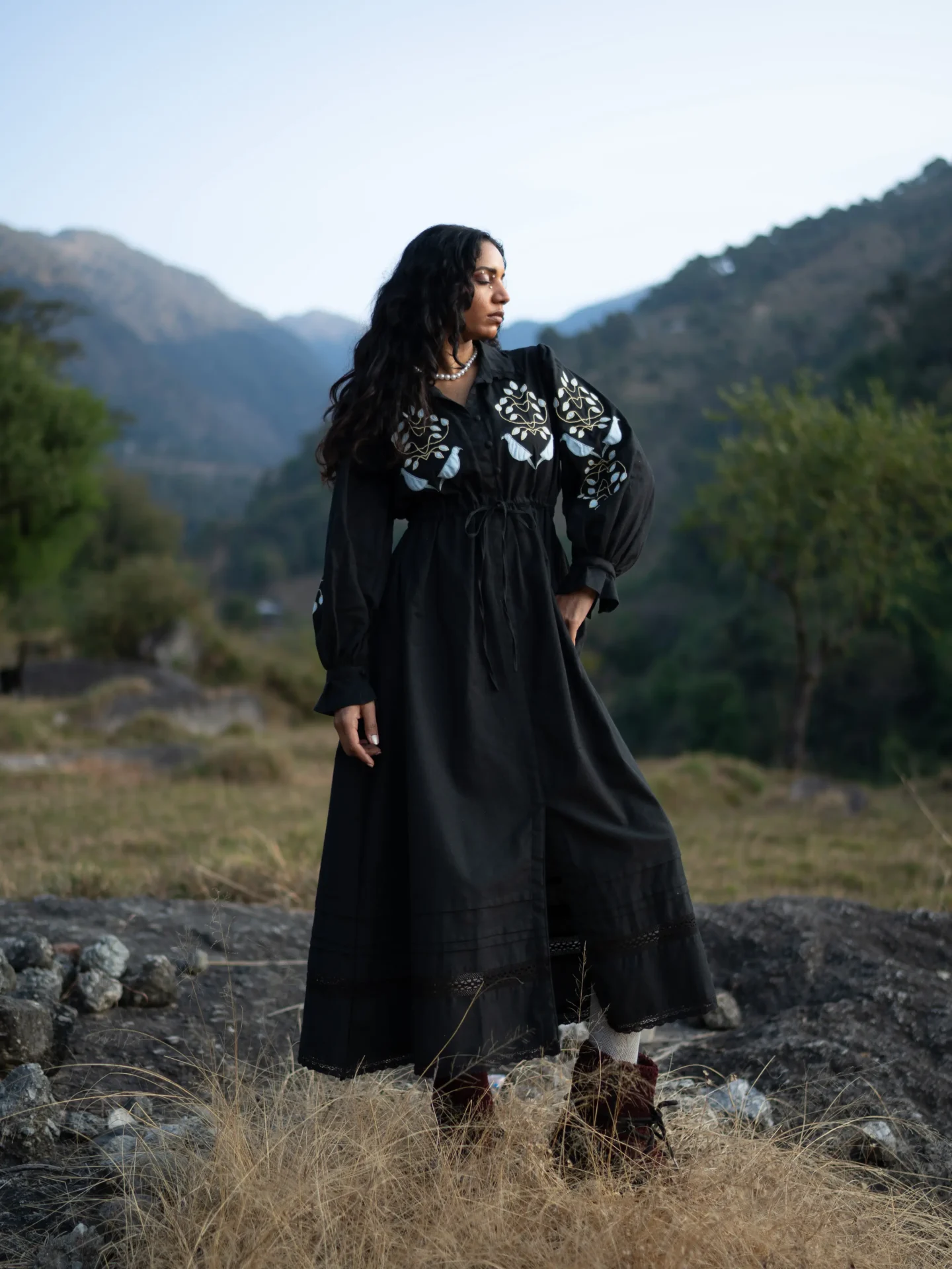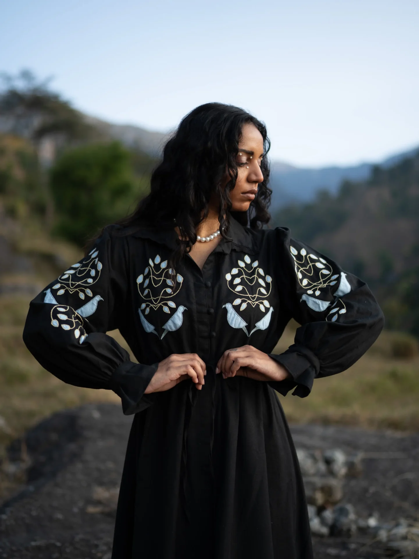 Designed with a classic shirt collar and a soft, flowing silhouette, this dress is adorned with appliqué hand embroidery that adds texture and artistry to the look. The adjustable drawstring at the waist allows you to clench and shape the fit exactly the way you like—relaxed or defined. Delicate lace detailing at the hem and collar brings a touch of vintage charm, making this piece both timeless and beautifully crafted.