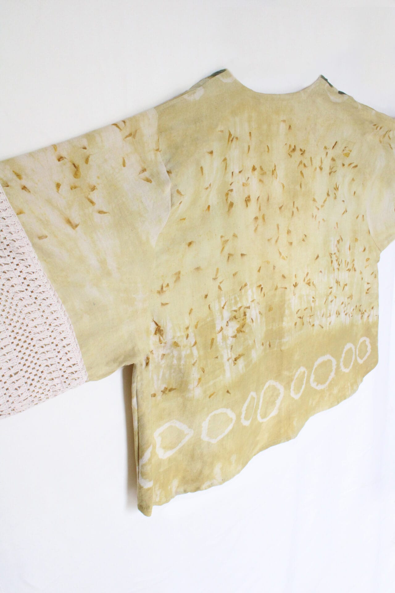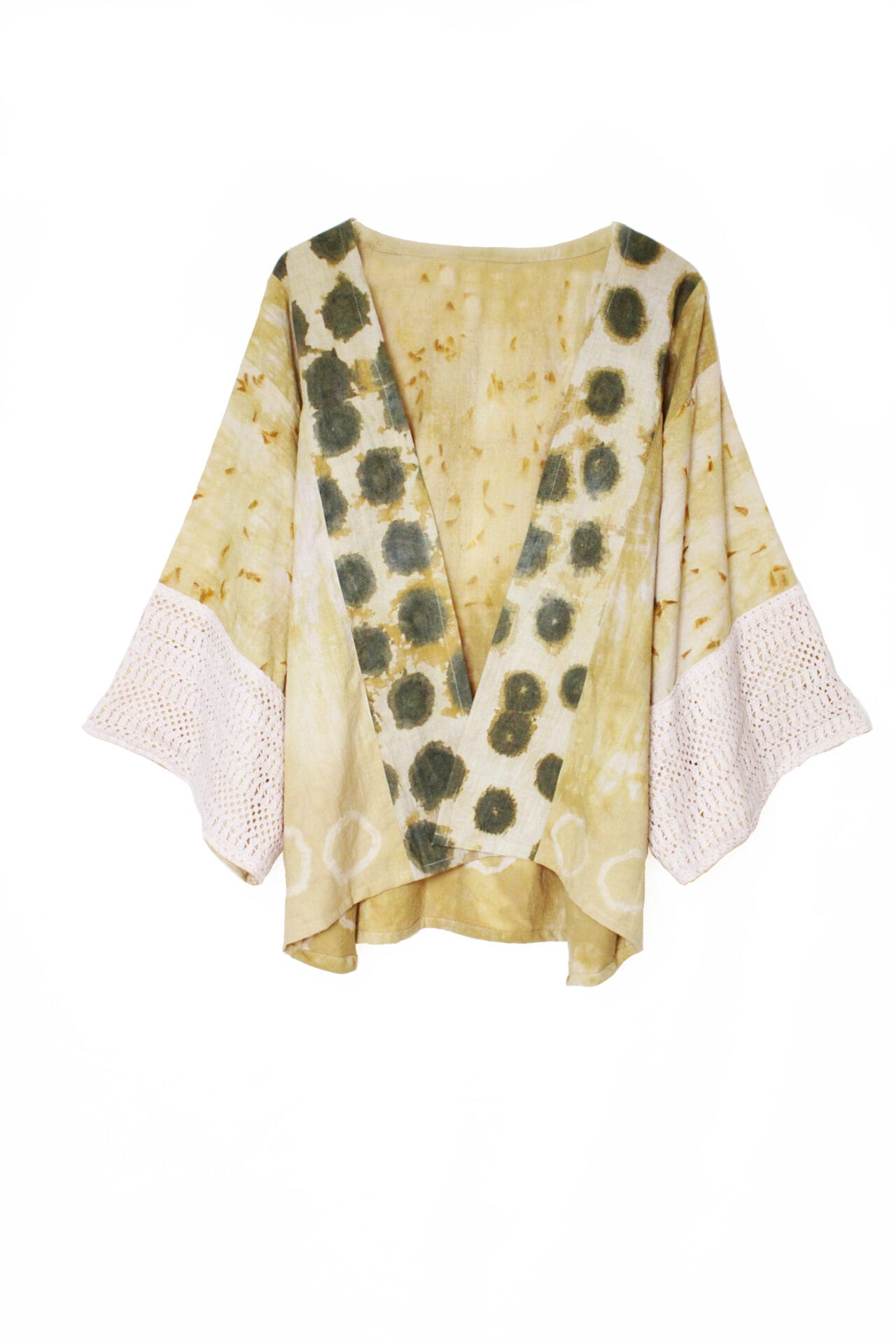 Bageeya’s “Vata Vriksha” Handspun Organic Cotton Breezy Jacket steps into the tranquil charm of nature . This breezy jacket is a harmonious blend of tradition and elegance, dyed using Ayurvedic herbs like Harda and sacred temple marigold flowers, known for their therapeutic properties that are gentle on the skin and kind to the planet. Crafted from handspun organic cotton sourced from the skilled artisans of West Bengal. This jacket embodies sustainable fashion at its finest.The design features a relaxed, free-size fit with a cool drape, making it an ideal choice for a beach vacation or as a stylish layer over a strappy dress. The jacket’s front panel is adorned with green polka dots, adding a touch of vintage flair, while the cuffs are detailed with 100% cotton schiffli, enhancing its artisanal appeal. This piece is entirely handcrafted, involving the meticulous work of five artisans who have brought this vision to life.Pair this versatile jacket with shell jewelry for a complete boho-chic look, perfect for evoking your true expression. Whether you’re lounging by the sea or stepping out for a casual day, this jacket offers both comfort and style. Care Instructions: