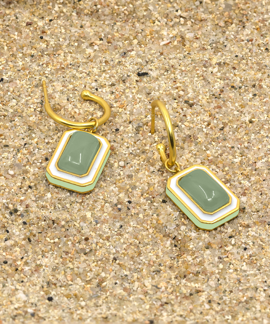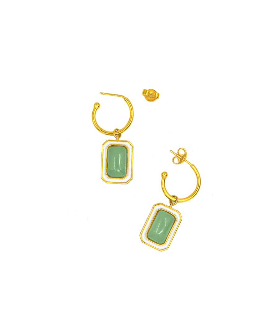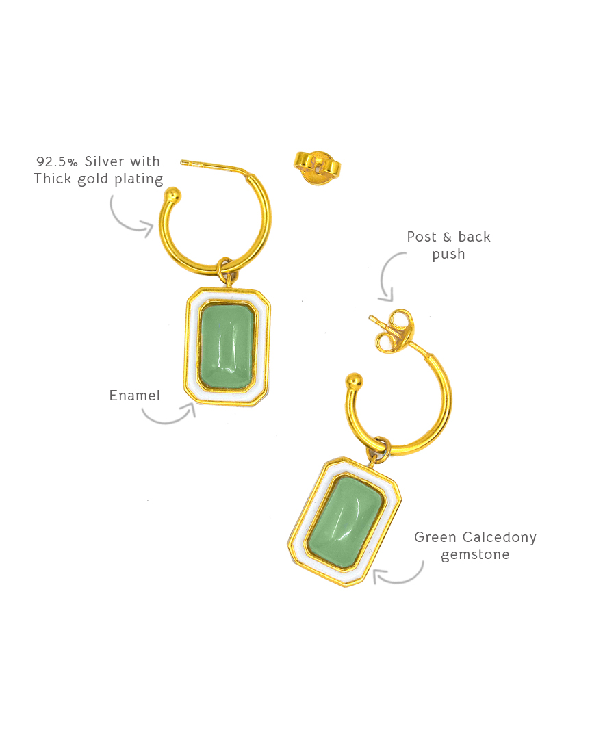 The C-hoop earrings are handcrafted in 92.5% silver,with thick gold plating with enamel details. These earring has a post with push back and has a natural gemstone called green calcedony, these earrings are super light and easy to wear., Plating: Gold Plated, Metal Type: 92.5% Sterling Silver, Enamel / plating / gemstone: Natural gemstone Green Calcedony, Lock Mechanism: Post and push back, Measurement cm : 3.2cm , Measurement inches: 1.25 inch, Care Instruction: Keep away from water, perfume and other liquids. Do not use any cleaning agents. Clean when storing in the provided pouches. Store them in moisture free areas and keep them away from water and liquid fragrances.