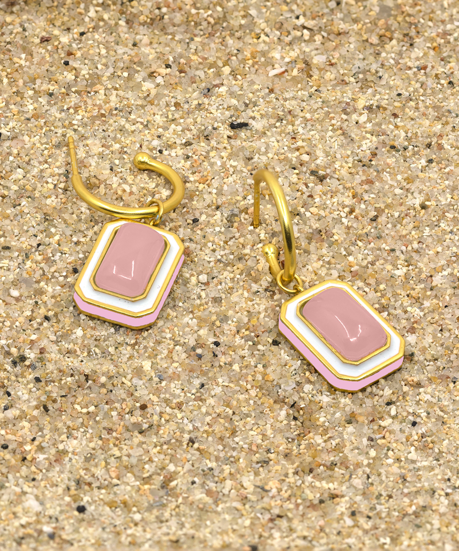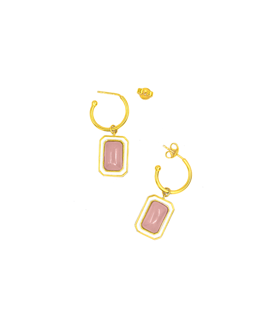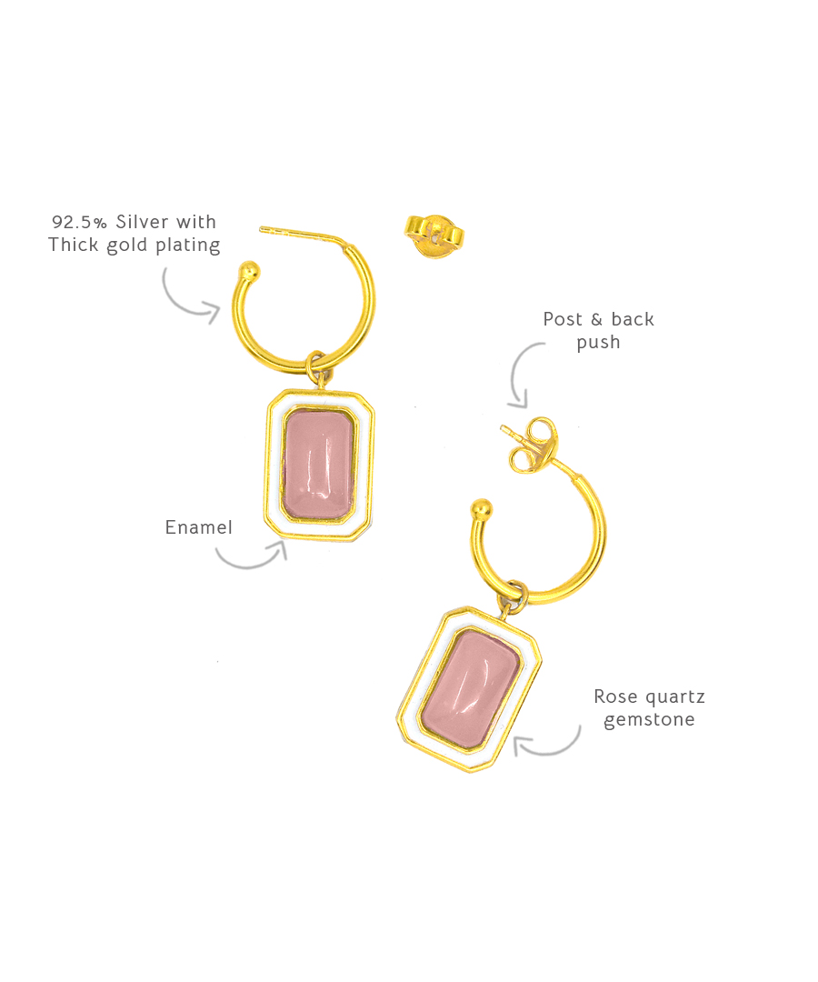 The C-hoop earrings are handcrafted in 92.5% silver,with thick gold plating with enamel details. These earring has a post with push back and has a natural gemstone called rose quartz, these earrings are super light and easy to wear., Plating: Gold Plated, Metal Type: 92.5% Sterling Silver, Enamel / plating / gemstone: Natural gemstone Rose Quartz, Lock Mechanism: Post and push back, Measurement cm : 3.2cm , Measurement inches: 1.25 inch, Care Instruction: Keep away from water, perfume and other liquids. Do not use any cleaning agents. Clean when storing in the provided pouches. Store them in moisture free areas and keep them away from water and liquid fragrances.