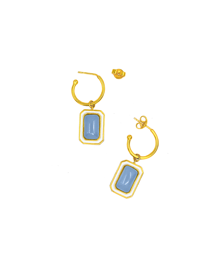 The C-hoop earrings are handcrafted in 92.5% silver,with thick gold plating with enamel details. These earring has a post with push back and has a natural gemstone called blue calcedony, these earrings are super light and easy to wear., Plating: Gold Plated, Metal Type: 92.5% Sterling Silver, Enamel / plating / gemstone: Natural gemstone Blue Calcedony, Lock Mechanism: Post and push back, Measurement cm : 3.2cm , Measurement inches: 1.25 inch, Care Instruction: Keep away from water, perfume and other liquids. Do not use any cleaning agents. Clean when storing in the provided pouches. Store them in moisture free areas and keep them away from water and liquid fragrances.