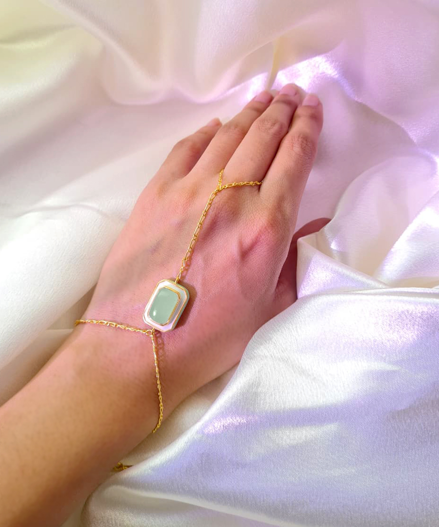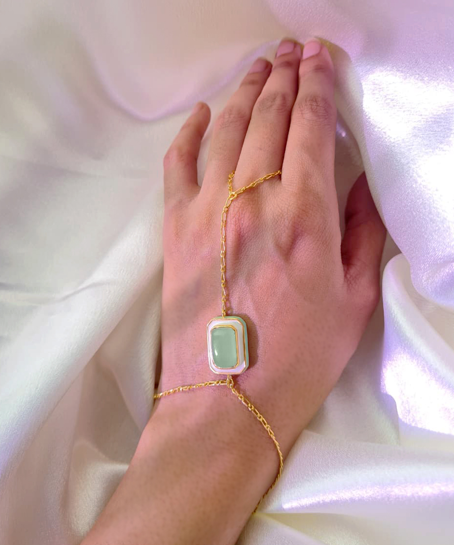 The hathfool bracelet with natural gemstone or the intricate details of enamelling, it is handcrafted in 92.5% silver, with thick gold plating. It has a ring clasp lock that can be fixed easily by you., Plating: Gold Plated, Metal Type: 92.5% Sterling Silver, Enamel / plating / gemstone: Natura gemstone Green Calcedony, Lock Mechanism: Ring clasp lock, Measurement cm : gemstone : 1.8 cm x 1.2 cm / Full length 6 cm, Measurement inches: Gemstone : 0.70 x 0.47 inches / Full length 2.36 inch, Care Instruction: Keep away from water, perfume and other liquids. Do not use any cleaning agents. Clean when storing in the provided pouches. Store them in moisture free areas and keep them away from water and liquid fragrances.