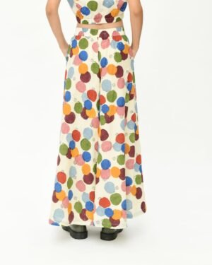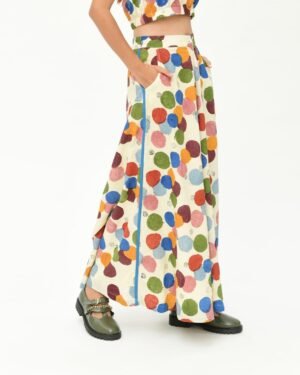 The Void Polka motif is meticulously handcrafted using eight hand-carved wooden blocks and eight rich natural colors, printed on handspun, handwoven fabric sourced from artisan villages in West Bengal. Each piece carries the touch of generations of skilled artisans, reviving age-old techniques through a contemporary lens. Inspired by Vedic tantric art and Songs of Tantra, this design fuses Rajasthani heritage with sustainable fashion, offering a timeless yet refreshing style statement.Design DetailsFabric & Material: 100% organic cotton, handspun & handwovenCraft: Traditional hand block printingLength (pant): 39 inchesDesign Elements: Flared bottoms, both side pocketsModel: 5'8", wearing size SFit: Relaxed silhouette