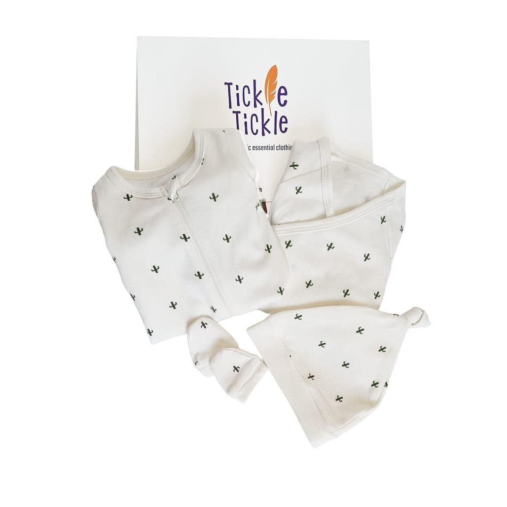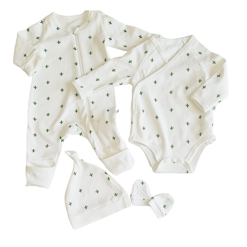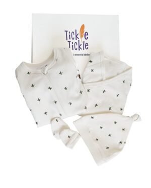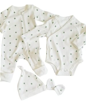 100% organic cotton• 5-piece set; Halfsleeve Bodysuit, Fullsleeve zipsleepsuit, Knotted Cap, Mittens, Teether• Size 0-9 Months• Suitable for baby boys & girls• Gift Box included