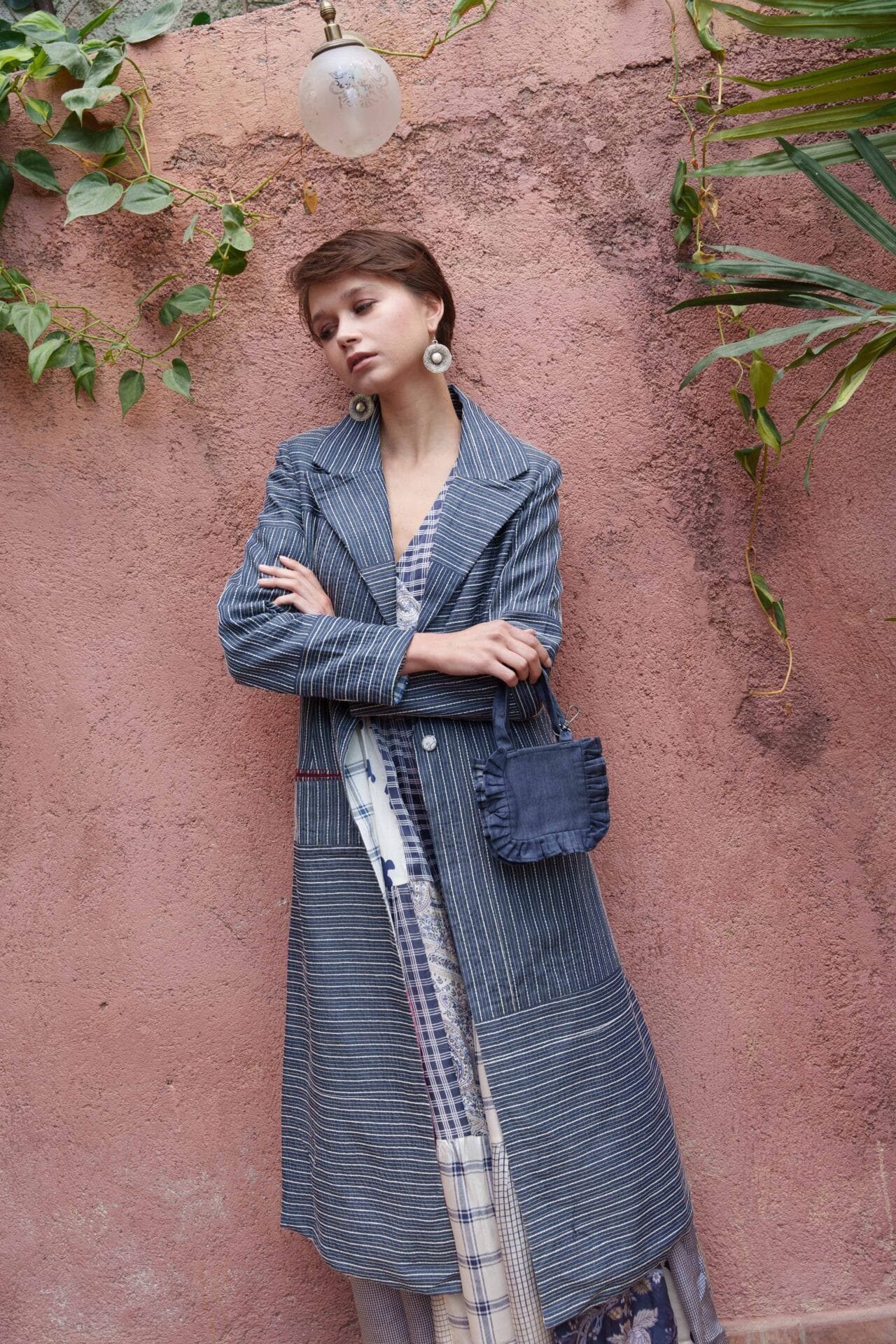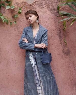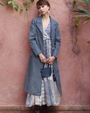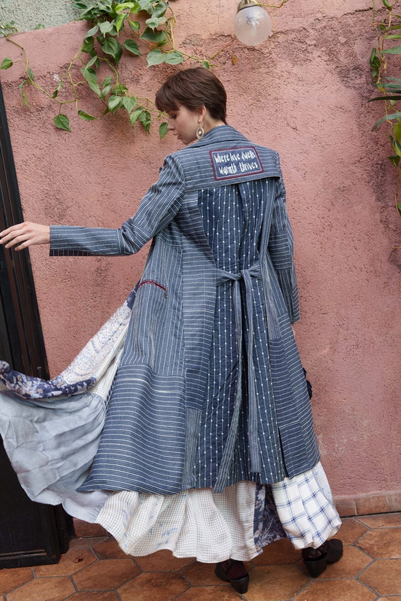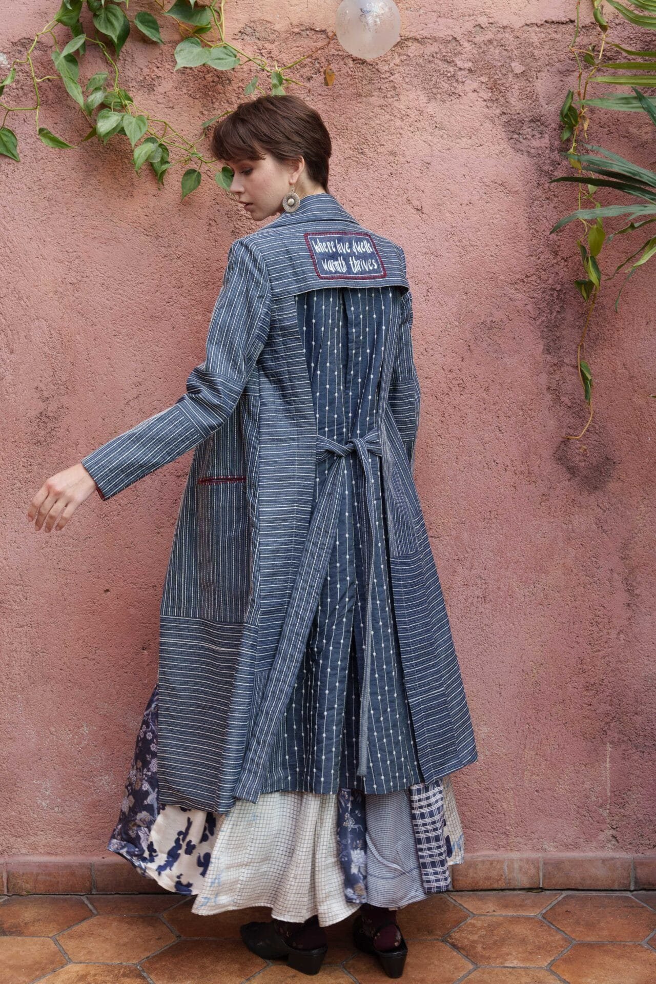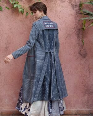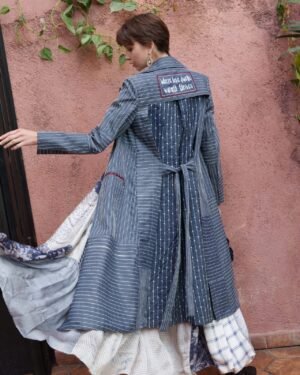 Blue denim all over kantha embroidered trench with slogan
