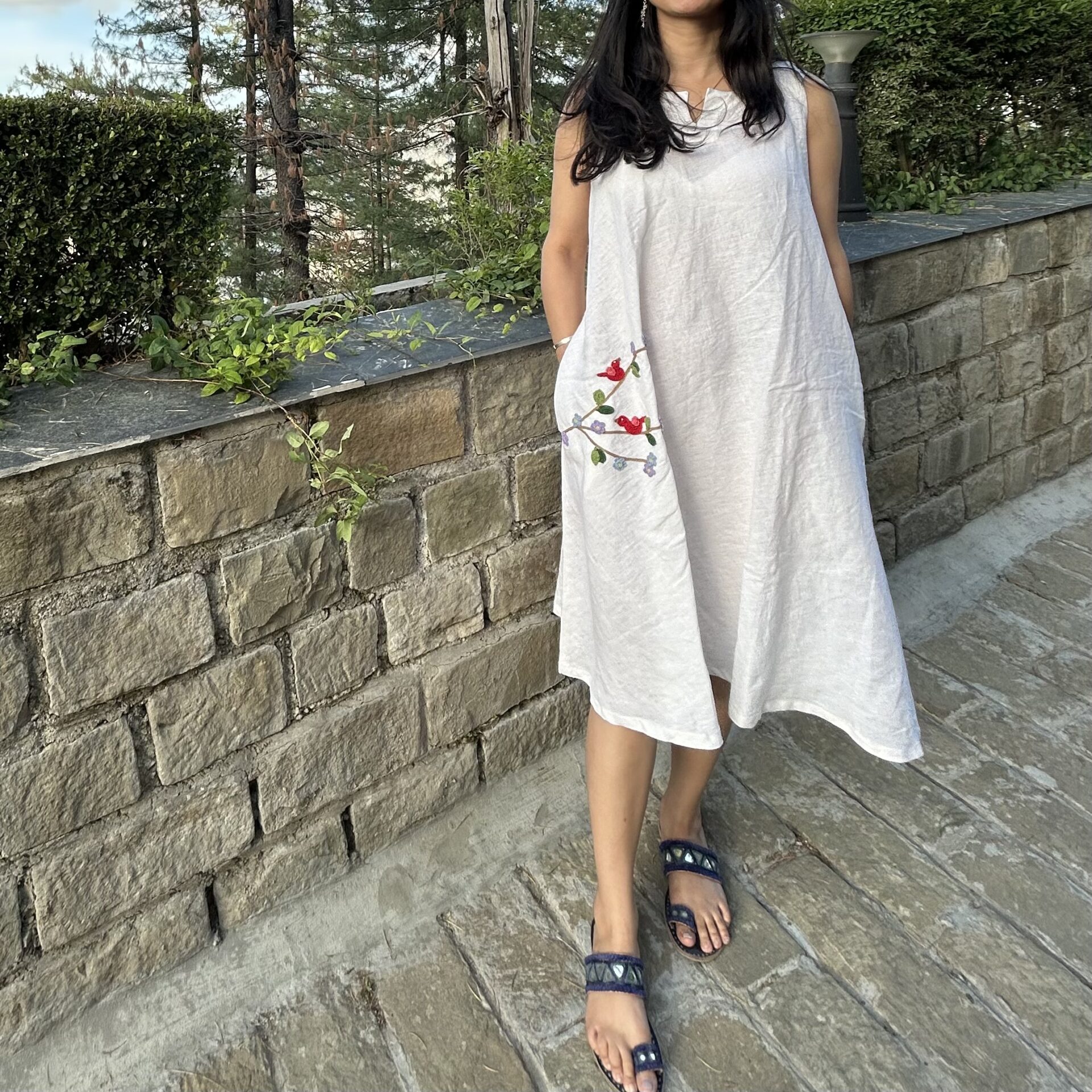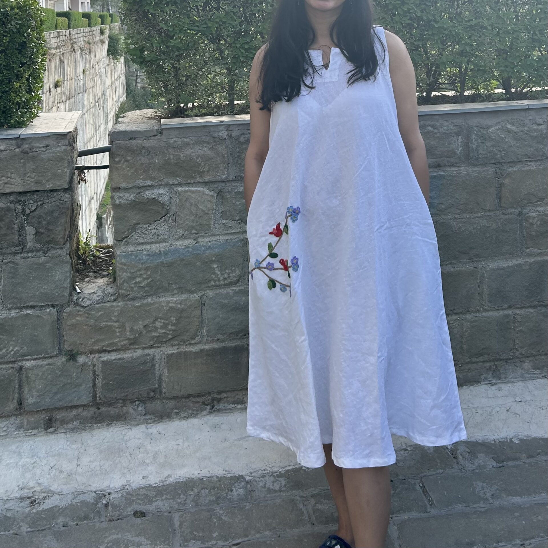 Step into timeless elegance with the White Birds & Blossoms Linen Dress. Crafted from premium linen, this sleeveless dress features a round neck with a center slit and a flared fit for effortless movement. With pockets on both sides and intricate crochet details of flowers and birds, it can be styled as both a kurta and a dress.