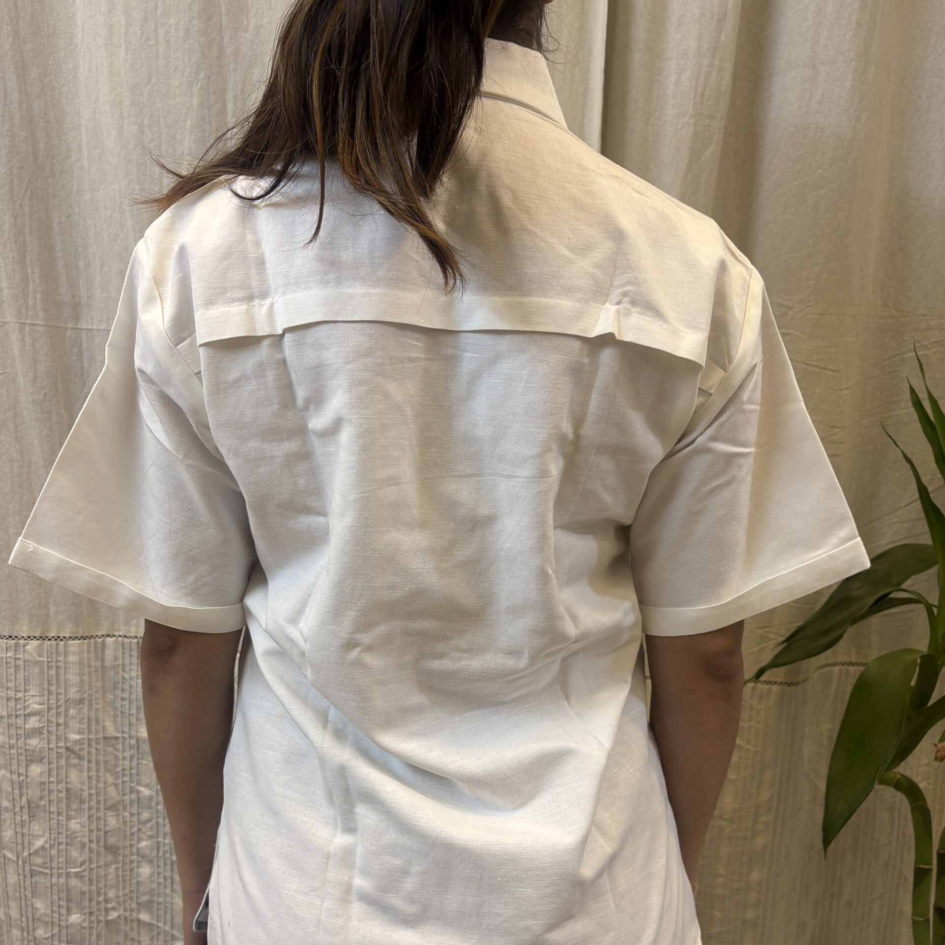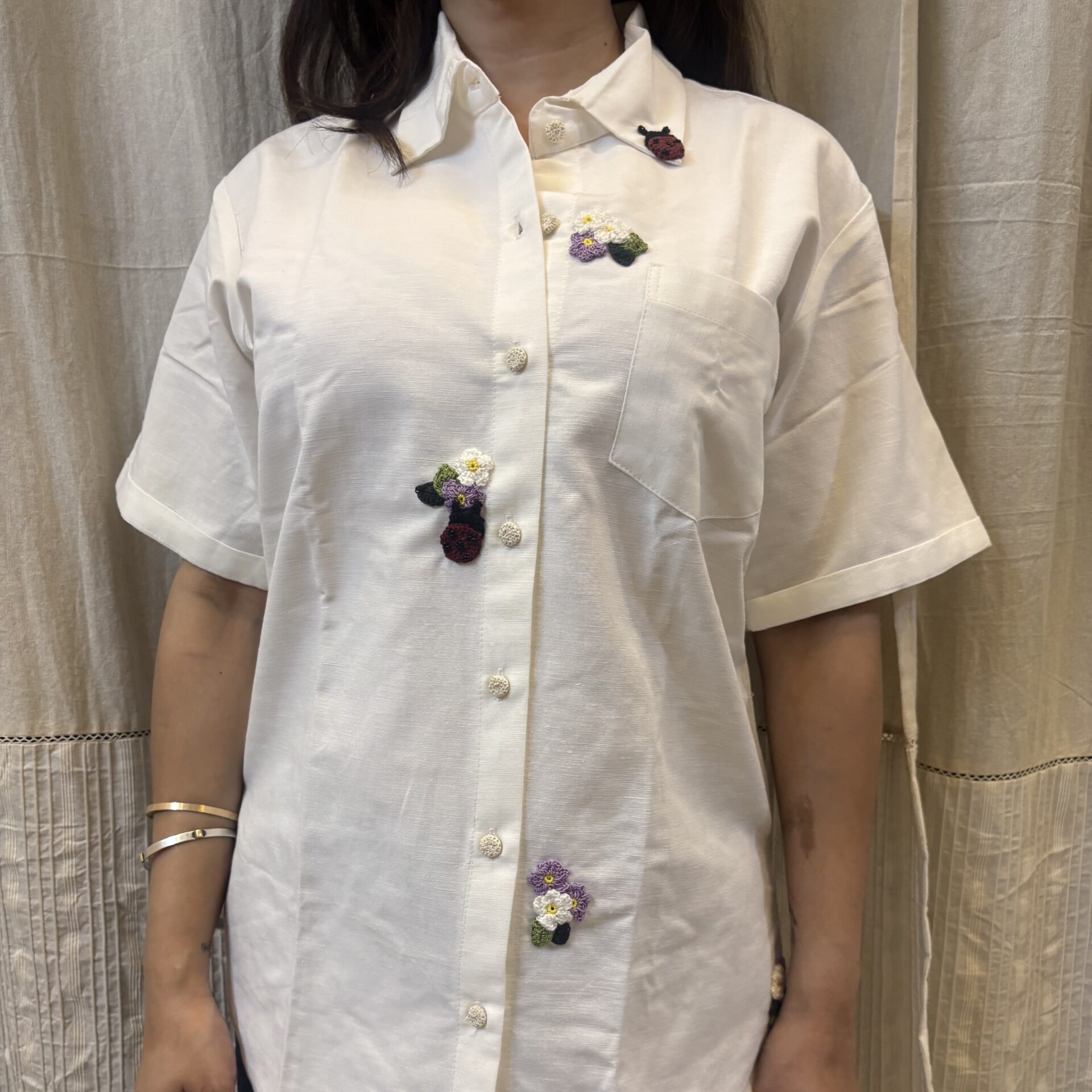 Women?s a breezy white shirt made with pure linen and scattered crochet flower details.