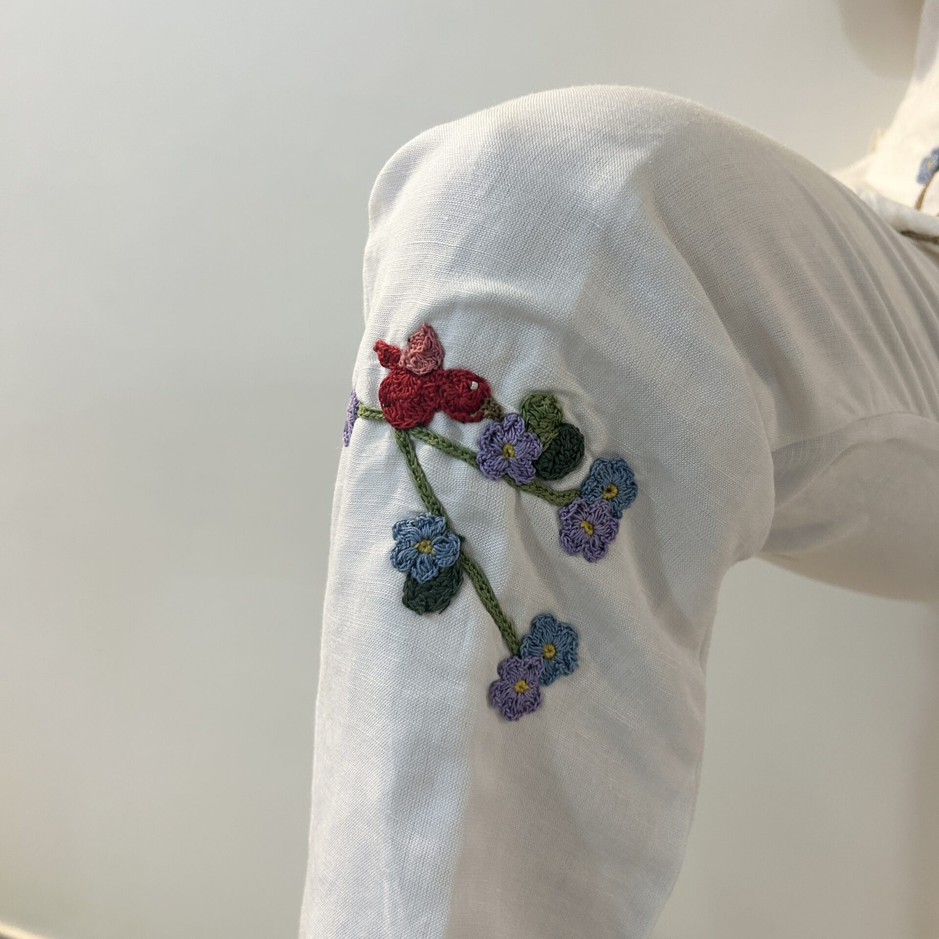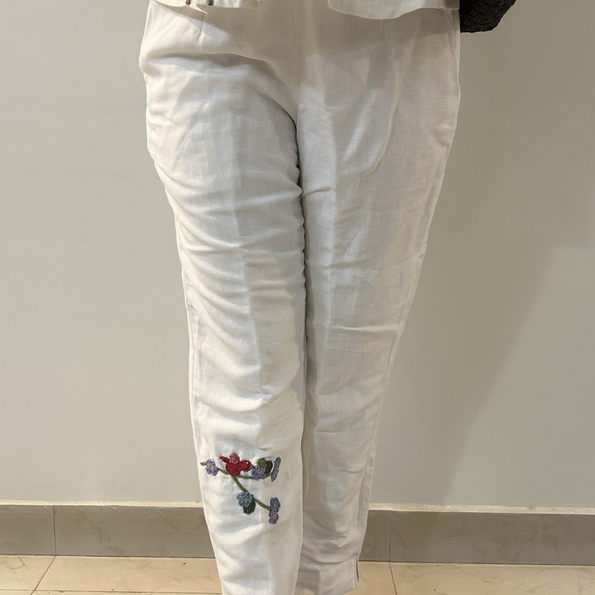 Elevate your wardrobe with the White Serene Stitch Linen Trousers. Crafted from premium linen in a crisp white, these trousers feature an elasticated back for comfort, a pocket on the right side, and a zip closure on the left. Detailed with delicate crochet daisies and a bird, they offer a refined and artisanal touch.