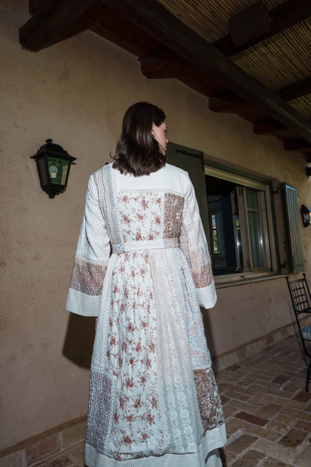This White splicing multi printed jacket with belt is a statement piece with intricate embroidery and quilting ? a blend of structure, heritage, and contemporary sophistication.