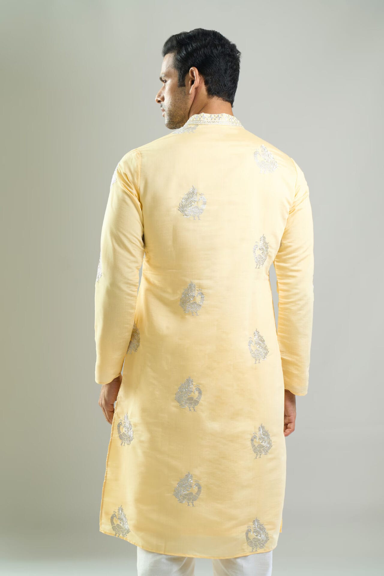 Yellow crepe silk based kurta enhanced with silver resham embroidery, paired with an off white dupion silk based pants.