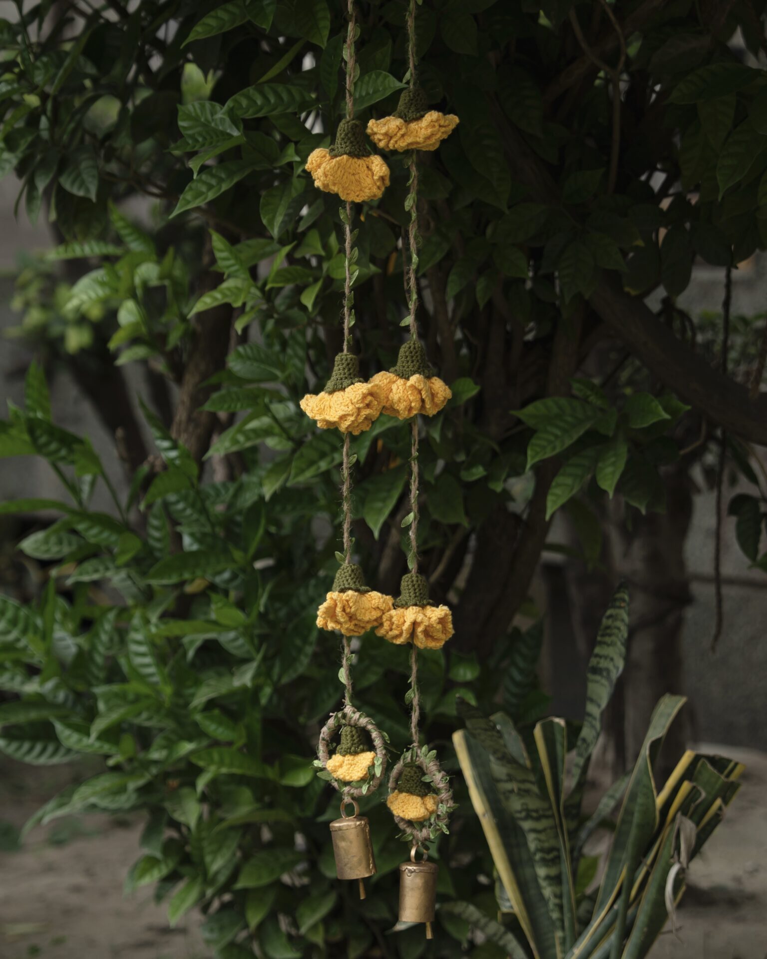 Celebrate the season of lights with handmade beauty that lasts beyond the festivities. This decor hanging brings together crochet marigold flowers on sturdy jute yarn, finished with a brass bell that adds a gentle, traditional chime. A loop at the top makes it easy to hang on doors, walls, or windows, filling your home with festive warmth and charm.