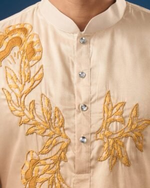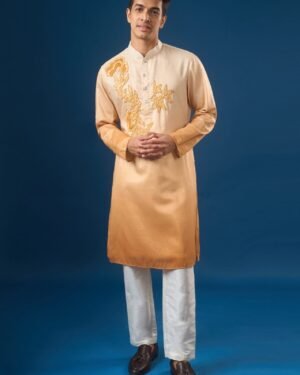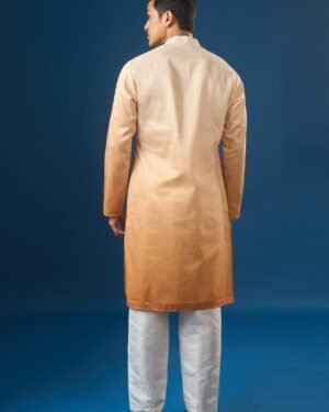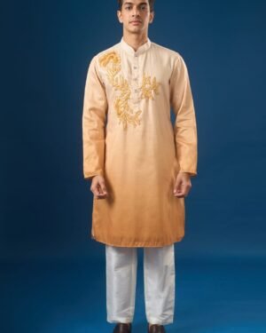Yellow ombre cotton silk based kurta enhanced with reasham embroidered motif paired with an off white dupion silk based pants.