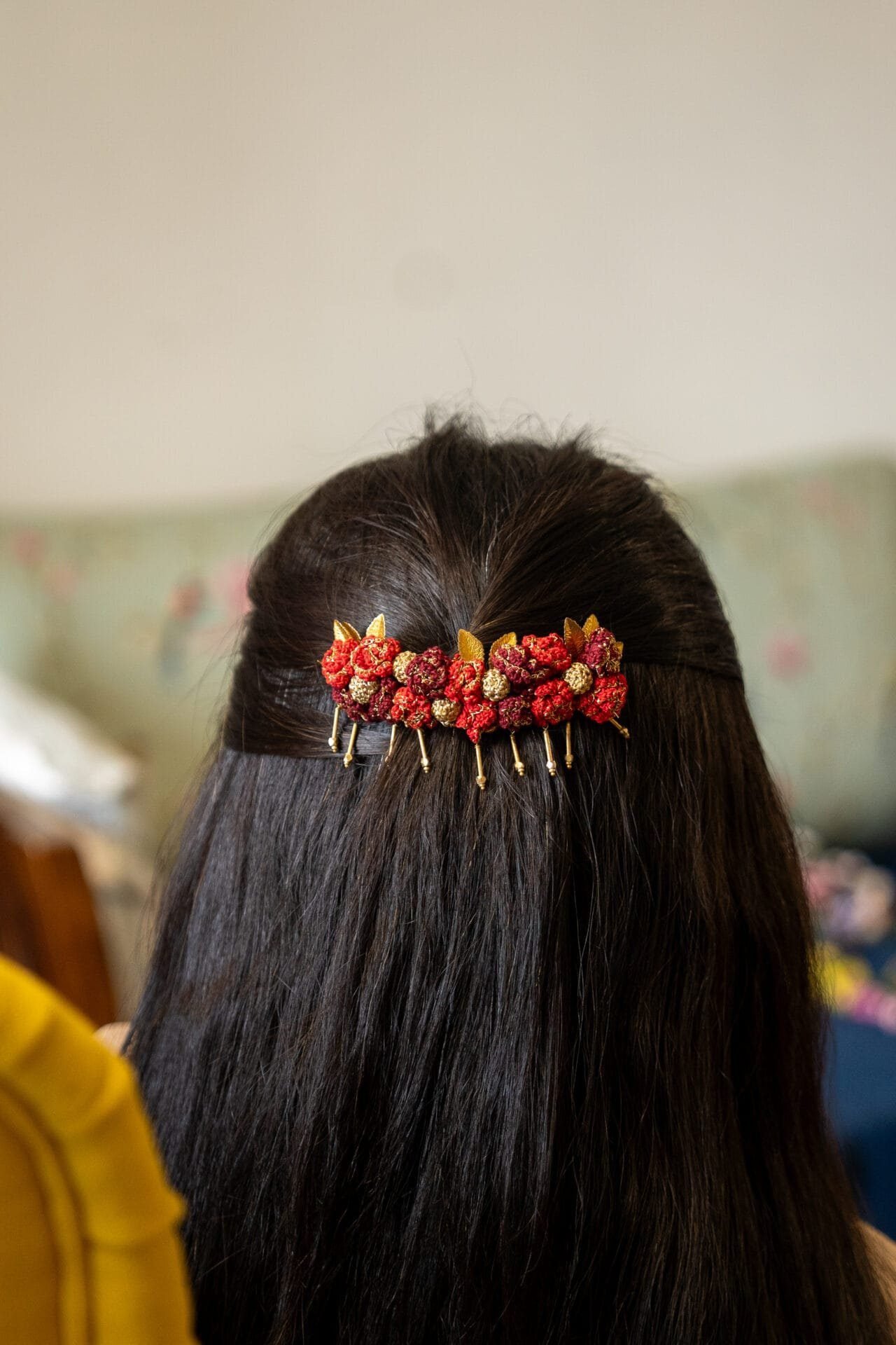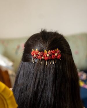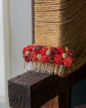 Crochet roses made with combining golden zari alongwith brass leaves.