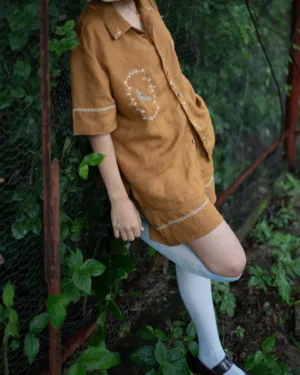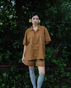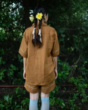 Crafted from breathable linen, this co-ord set includes relaxed-fit shorts with a clean front, back elasticated waistband, soft front pleats, and delicate hand embroidery along the hem—balancing function with style.
