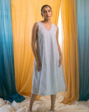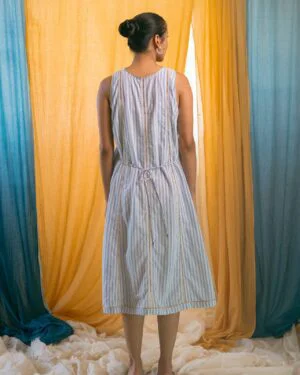 Made from 100% cotton fibres and natural materials, the AY Lace Detail Dress is crafted in pastel blue striped handwoven cotton. It features ladder lace inserts running along the panels, hand-done Kantha lines and Chanderi piping as a finishing detail.