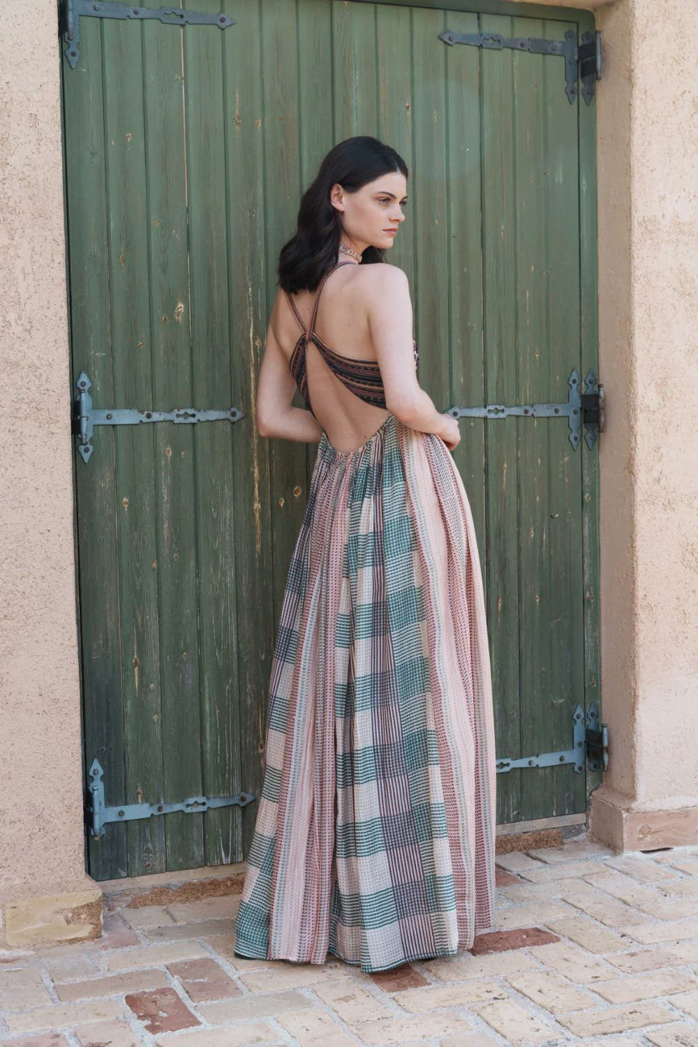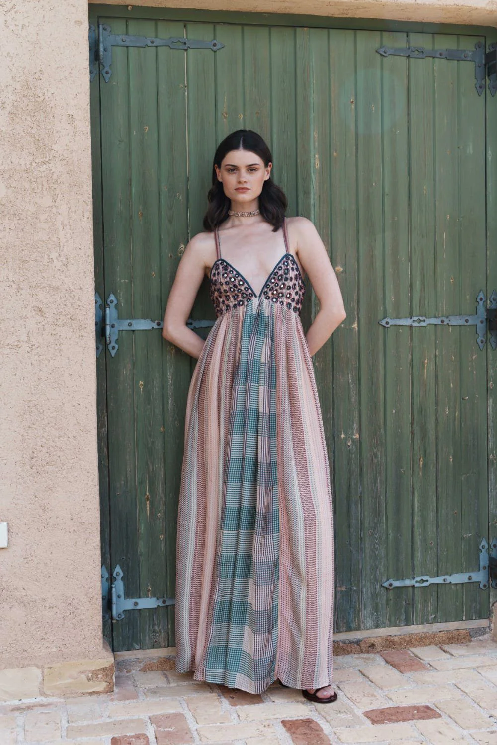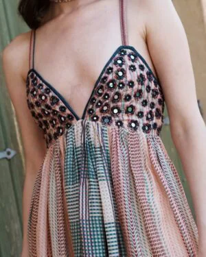 A beautifully detailed Beige multi printed maxi with mirror embroidered bodice that reflects Pinnacle by Shruti Sancheti?s artisanal precision and timeless design language.