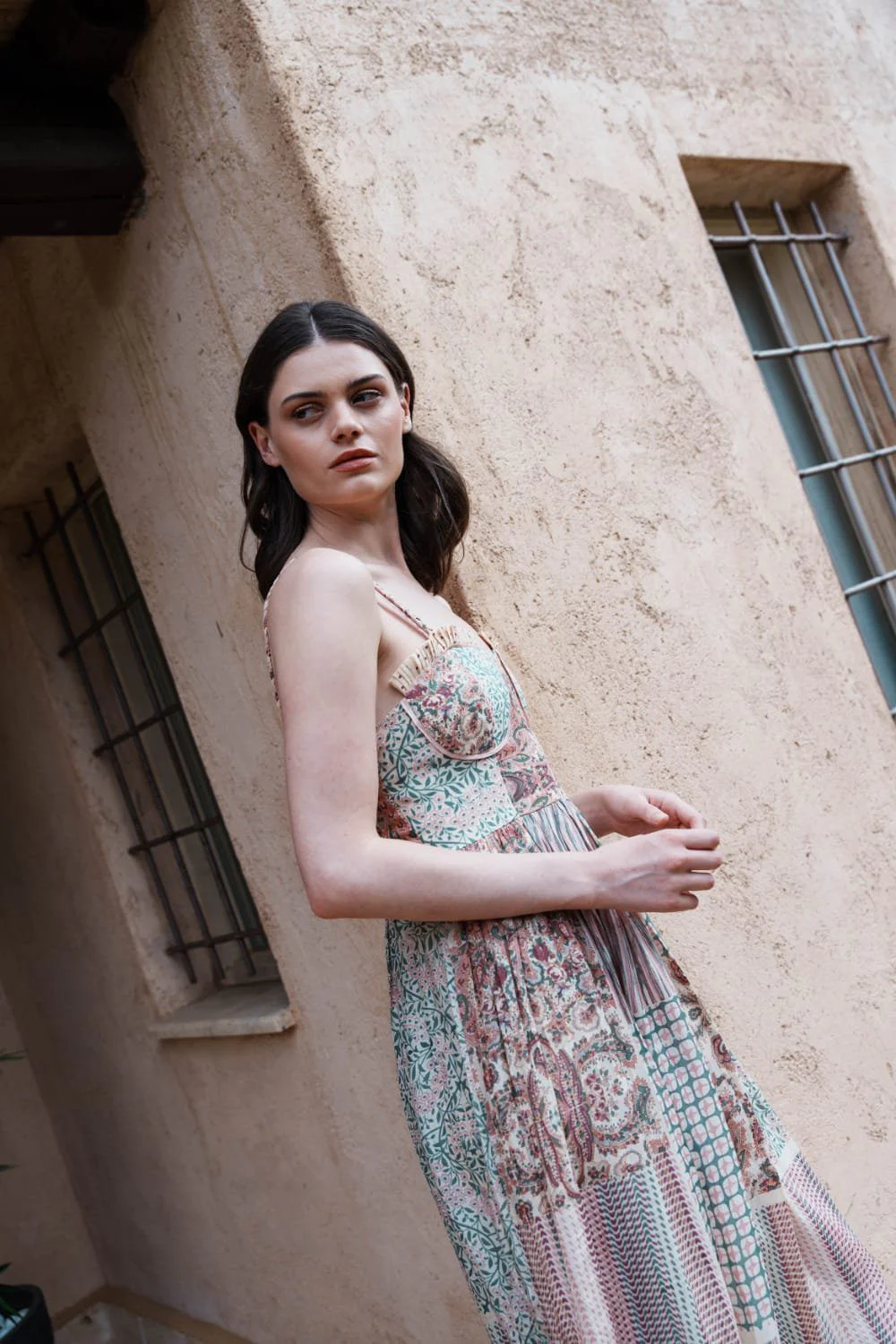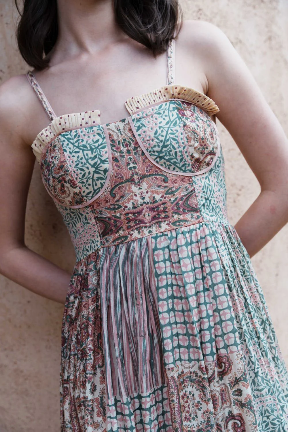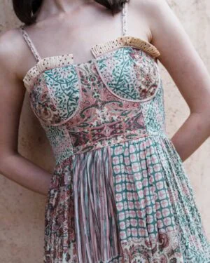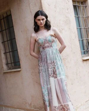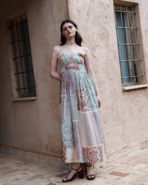 Crafted in fine fabric, this Beige spliced multi-printing gathered mul dress with belt showcases Pinnacle by Shruti Sancheti?s timeless craftsmanship and feminine grace. A perfect piece for effortless day-to-evening elegance.