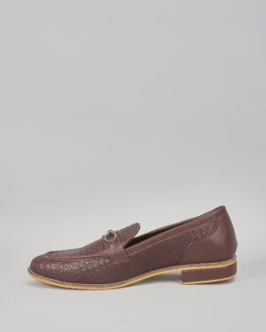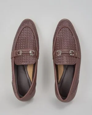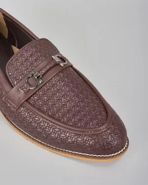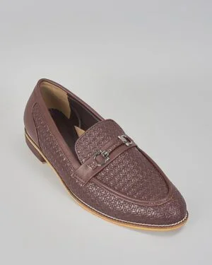 A pair of brown full grain leather based handcrafted shoes, enhanced with buckle detail. It has a padded leather lining and a hard sheeted rubber sole.