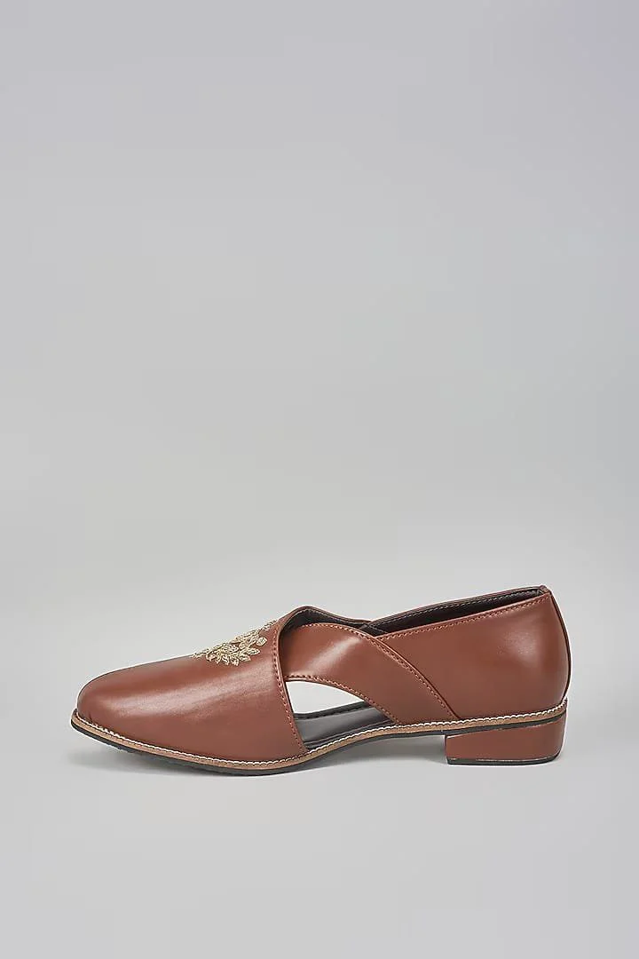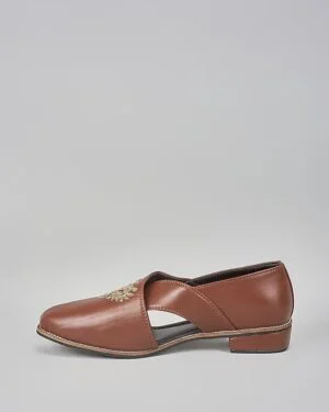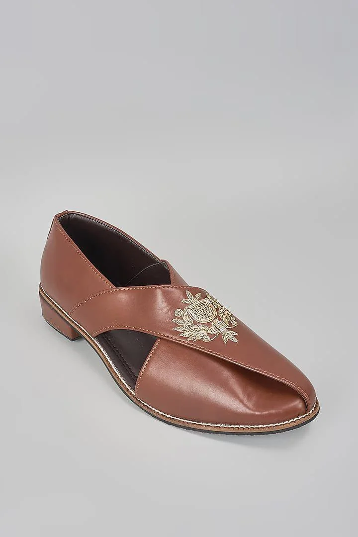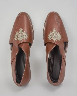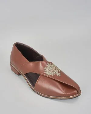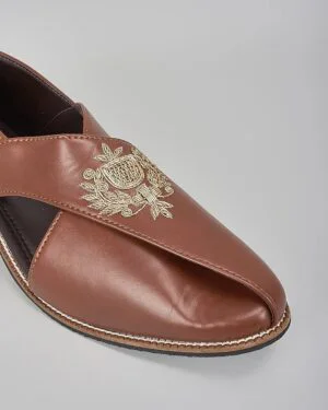A pair of brown leather based slip on peshawaris enhanced with hand embroidered royal crest. It has a padded leather lining and a hard sheeted rubber sole.