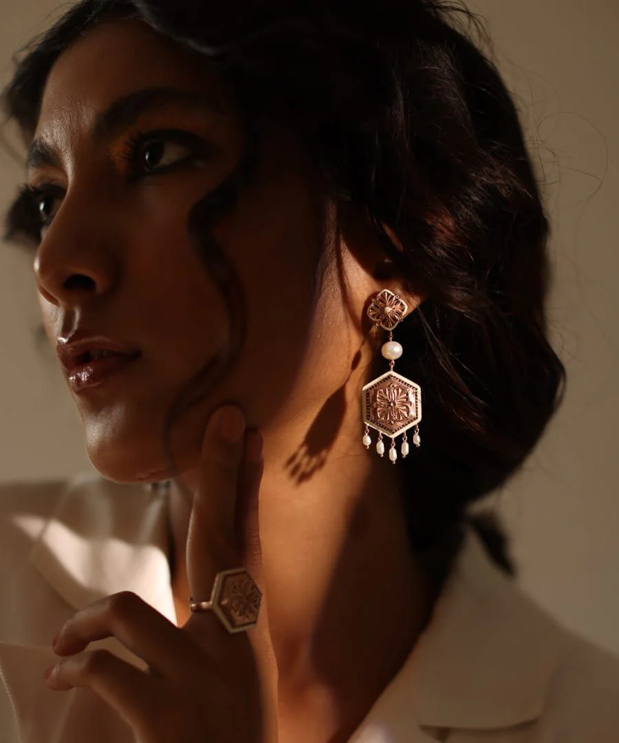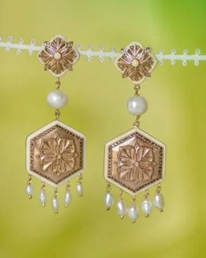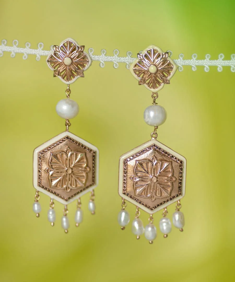 Elegant long earrings crafted in 92.5% sterling silver feature detailed enameling, rose gold plating, sparkling zircon accents, hanging beads, and a central pearl for a chic festive look.