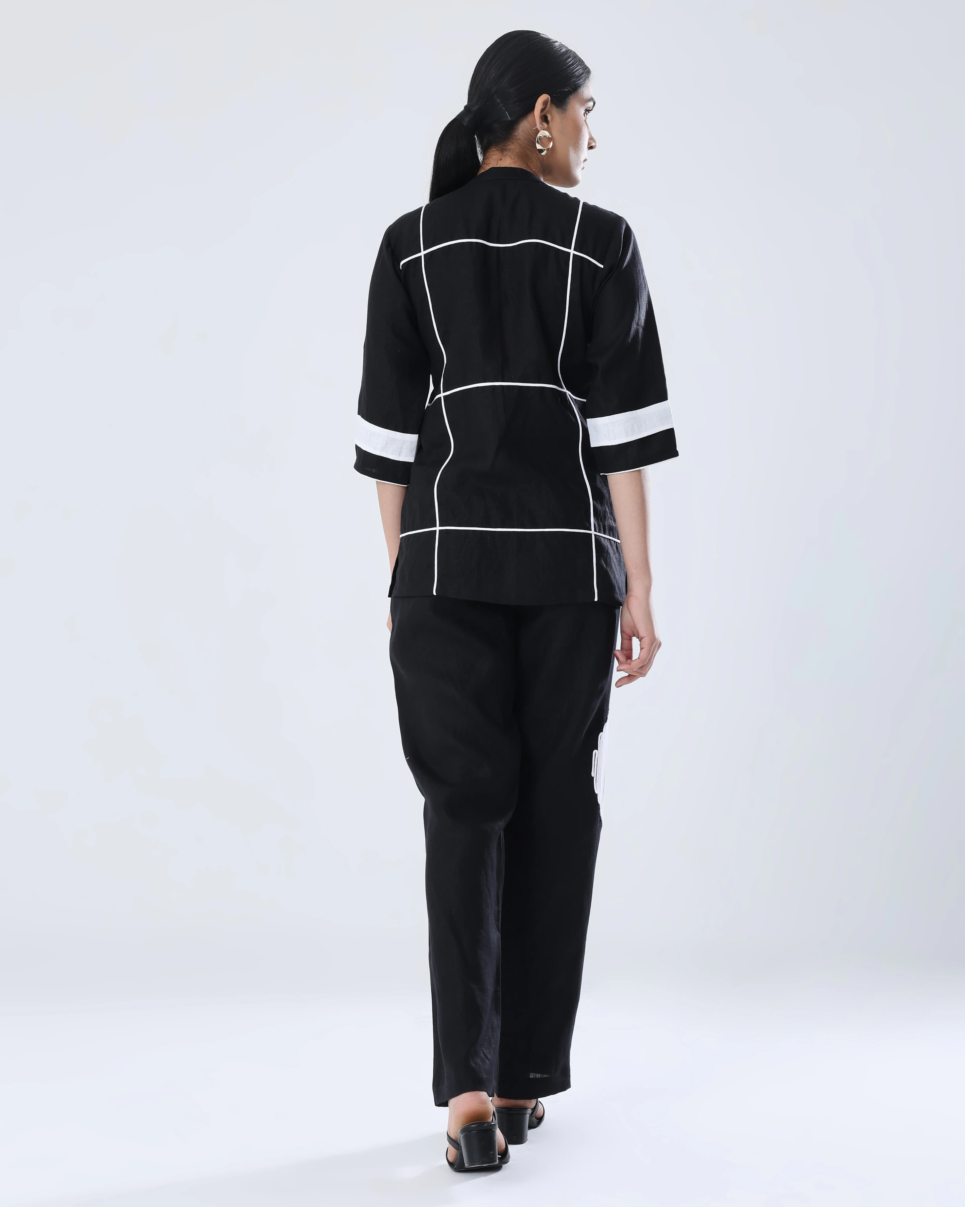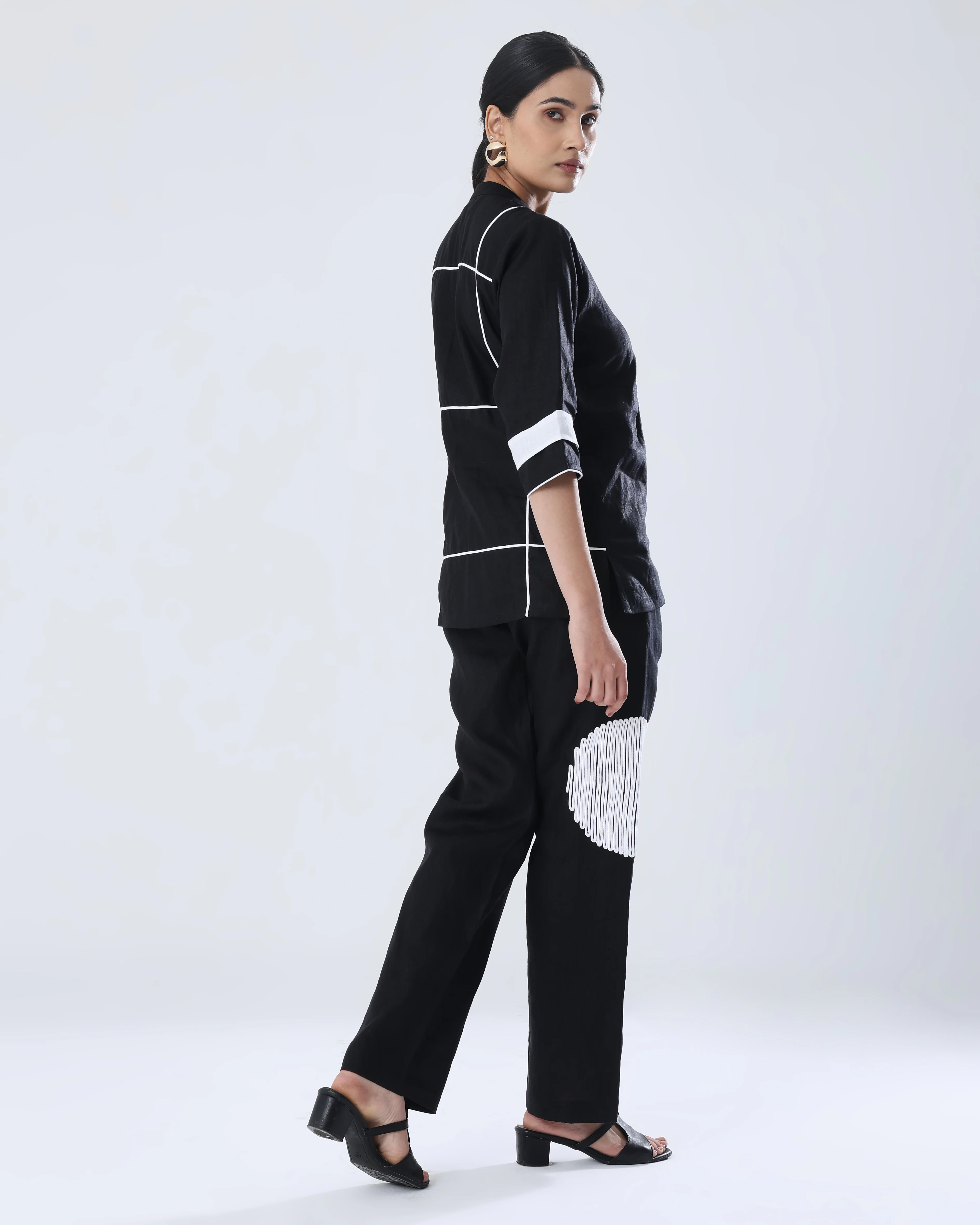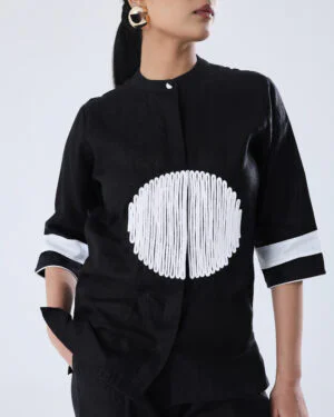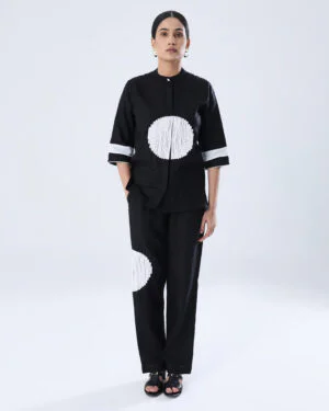 Make a bold yet elegant statement with this CHARCOAL CO-ORD SET in 100% Hemp. Designed for comfort and style, this set includes a sleek button-up top and matching straight-cut trousers. The standout feature is the abstract white circular dori embellishment, creating a striking contrast on the deep black fabric. Perfect for casual outings or semi-formal gatherings, this set combines modern aesthetics with timeless appeal.