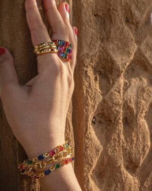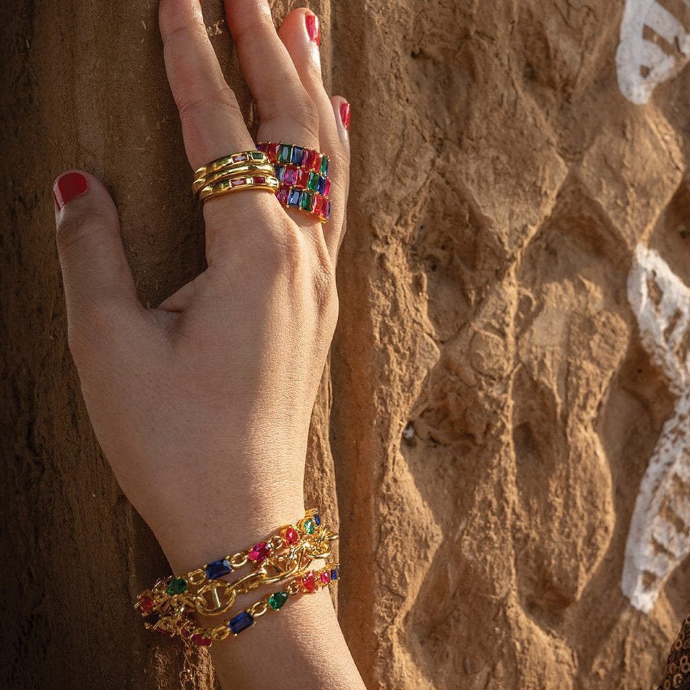 Immerse yourself in the luminous charm of our Chromatic Cascade Bracelet, named for its vibrant array of uneven multi-colored CZ gemstones. Each gemstone captures the enchanting hues of a vibrant sunset, adding a playful touch of whimsy to your ensemble with every sway.