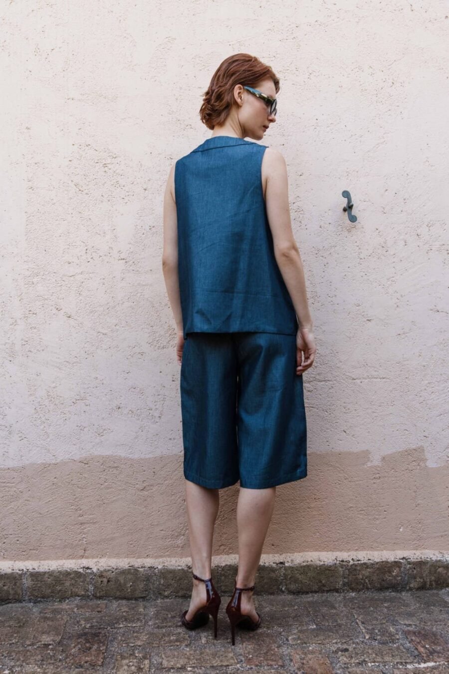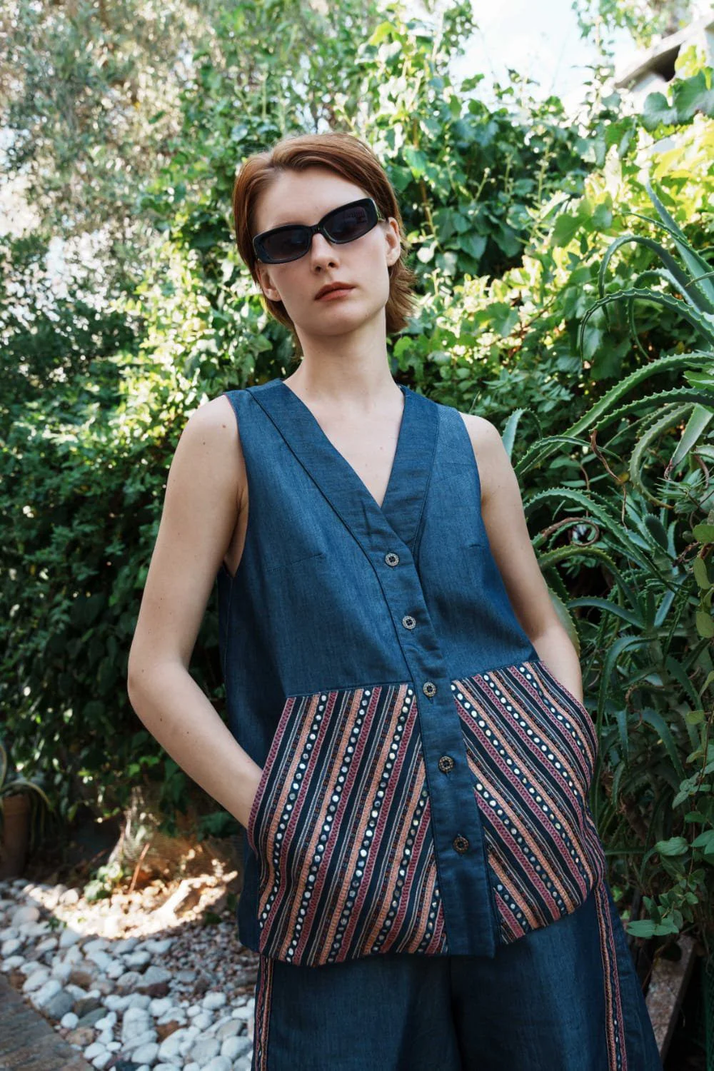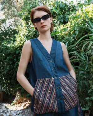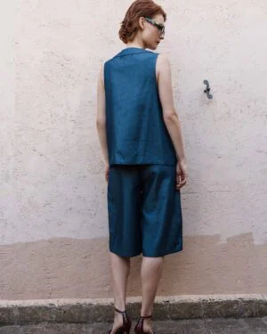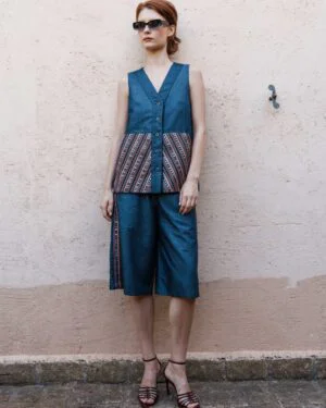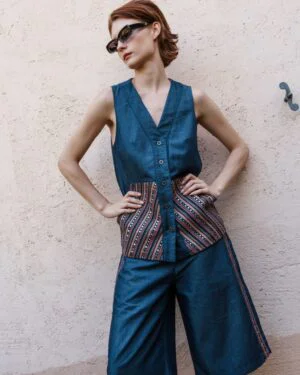 A coordinated Denim embroidered waistcoat with embroidered bermuda shorts set that celebrates fine detailing and fluid silhouettes ? an ode to Pinnacle?s handcrafted modern luxury.