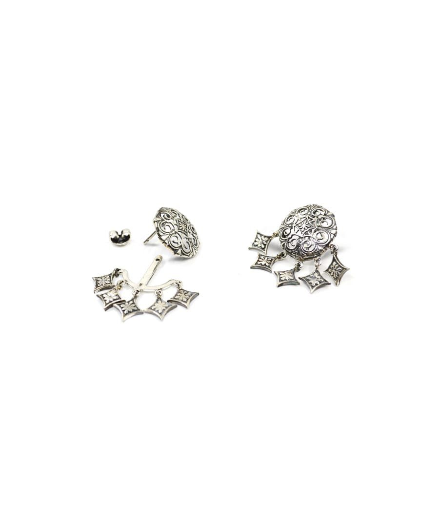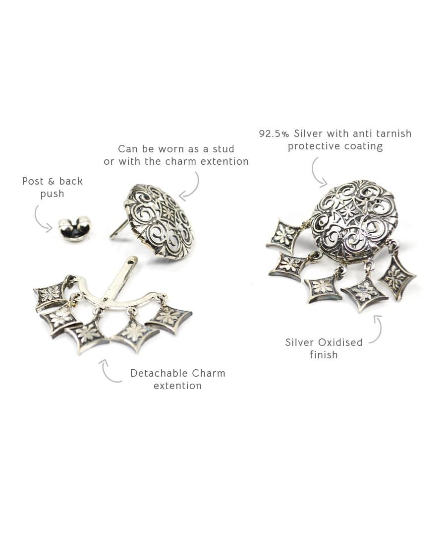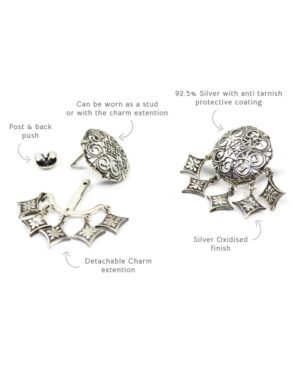 These dhora murki earrings can be worn like a stud earring or like a shoulder duster with charm extention. The charm extention jacket can be removed easily from the post of the earring back. These earrings are handcrafted in 92.5% silver with anti tarnish coating in silver oxidised finish. These earrings has a post and push back mechanism. , Plating: Silver Ani-tarnish with oxide finish, Metal Type: 92.5% Sterling Silver, Enamel / plating / gemstone: Silver oxidised, Lock Mechanism: Post and push back, Measurement cm : Studs diameter