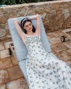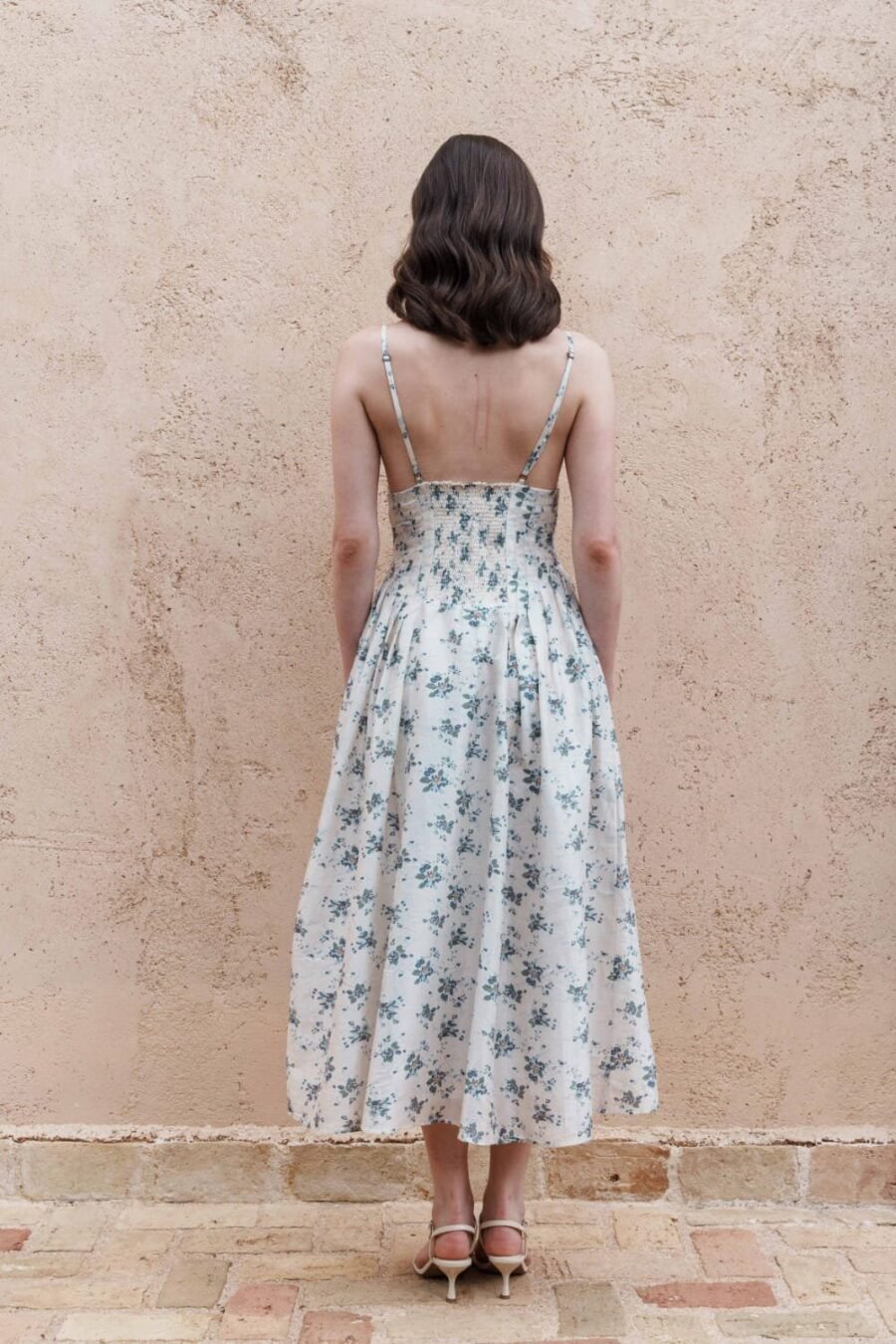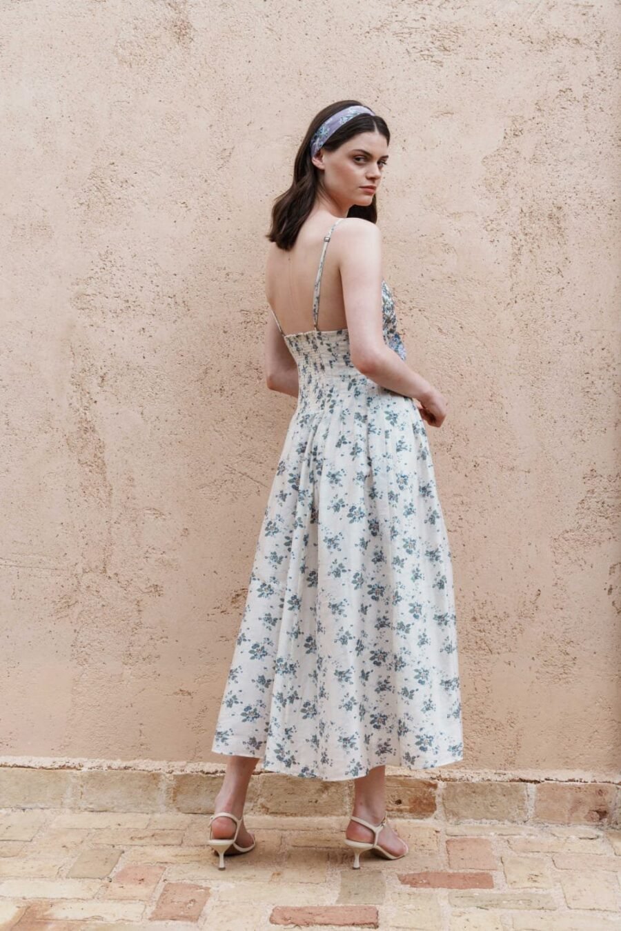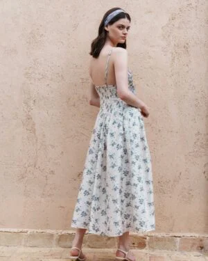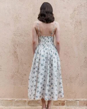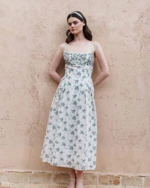 Crafted in fine fabric, this Ecru chanderi floral printed and pleated midi dress with lace embroidered bodice showcases Pinnacle by Shruti Sancheti?s timeless craftsmanship and feminine grace. A perfect piece for effortless day-to-evening elegance.