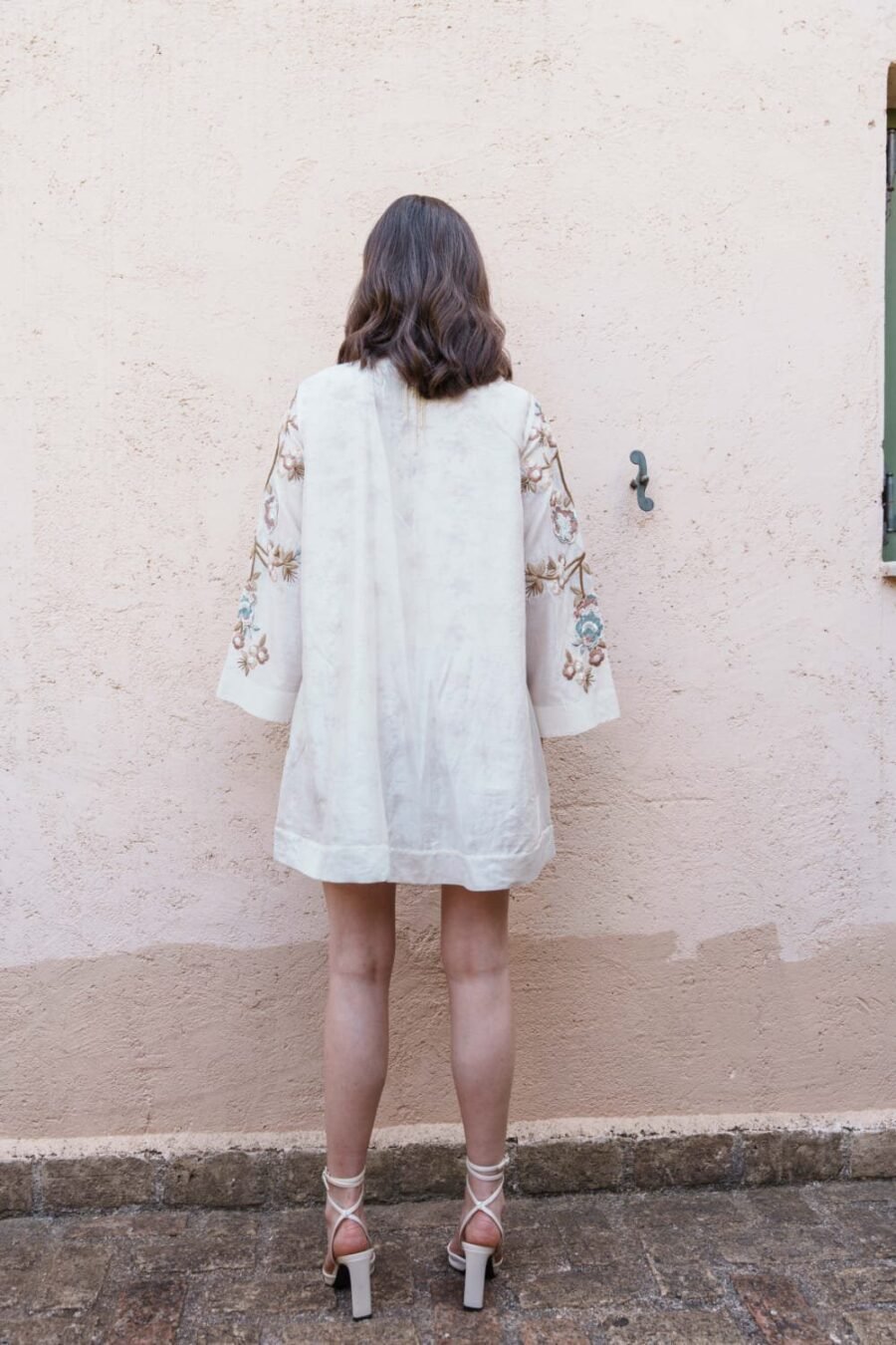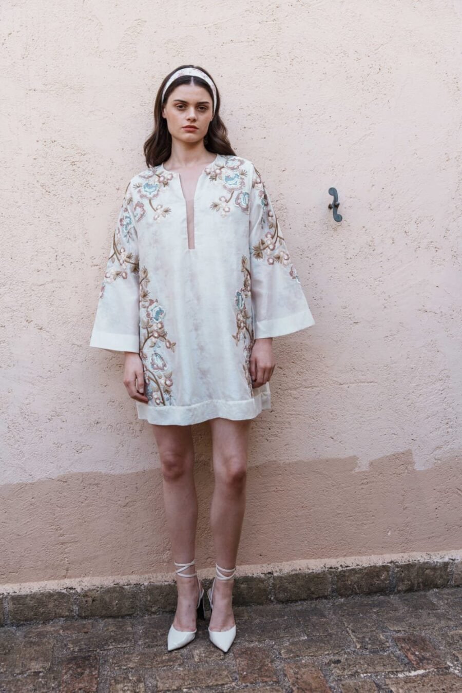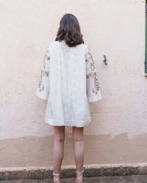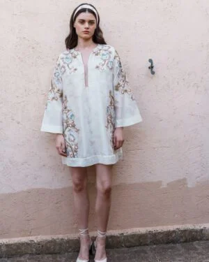 Crafted in fine fabric, this Ecru chanderi mini dress with embroidered applique dress showcases Pinnacle by Shruti Sancheti?s timeless craftsmanship and feminine grace. A perfect piece for effortless day-to-evening elegance.