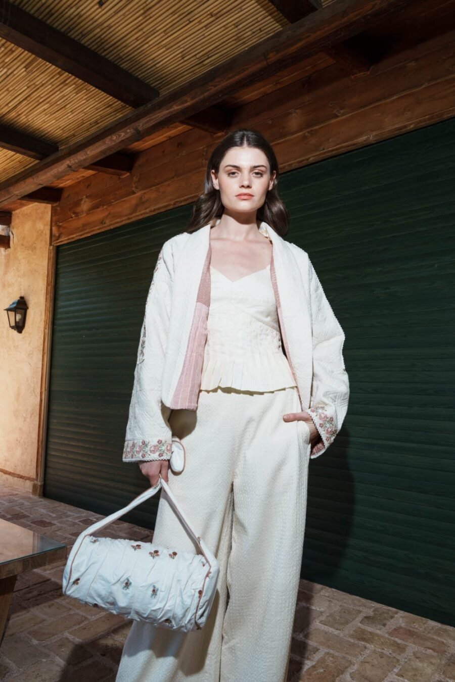 This Ecru cotton rose lace quilted tree of life jacket with embroidered borders is a statement piece with intricate embroidery and quilting ? a blend of structure, heritage, and contemporary sophistication.