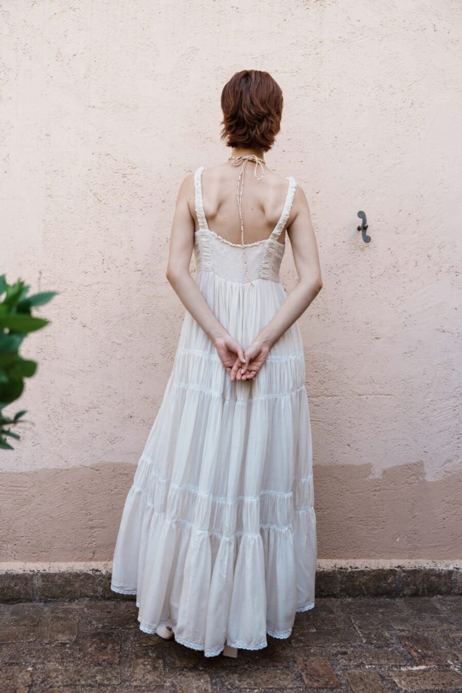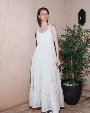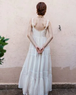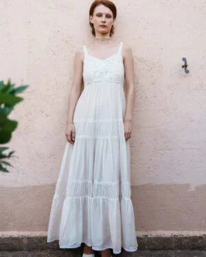 Crafted in fine fabric, this Ecru mul tiered dress with floral embroidery bodice showcases Pinnacle by Shruti Sancheti?s timeless craftsmanship and feminine grace. A perfect piece for effortless day-to-evening elegance.