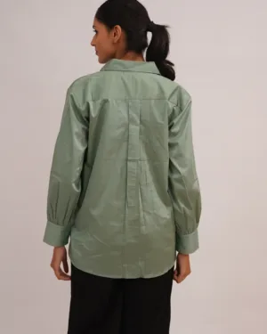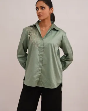 A gentle balance of elegance and allure. This serene green shirt is a celebration of refined simplicity, accentuated with delicate hand-embroidered motifs cascading gracefully over the shoulder. The subtle sheen of its satin-cotton fabric reflects understated luxury, while its relaxed silhouette ensures effortless sophistication. It’s where contemporary tailoring meets timeless femininity.
