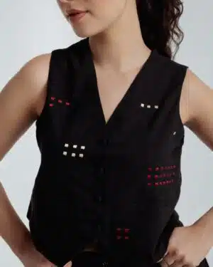 This bohemian black waistcoat, crafted from fine handwoven organic cotton spun in Bengal, features delicate embroidery in contrasting red and beige hues, adding warmth and character. Fully lined for a crisp, structured fit, it is as versatile as it is elegant — pairing beautifully with both skirts and trousers, and effortlessly elevating any look.The coordinating black pants are a timeless classic, featuring a front zipper, practical side pockets, and a clean, tailored finish. Made from the same handspun organic cotton, they transition seamlessly from day to night and are especially striking when styled with the waistcoat.Effortless, refined, and rooted in tradition — Fayra is a celebration of heritage craftsmanship and understated sophistication.Waistcoat length: 17 inchesPants length: 40 inchesModel height: 5’7” (wearing size S)