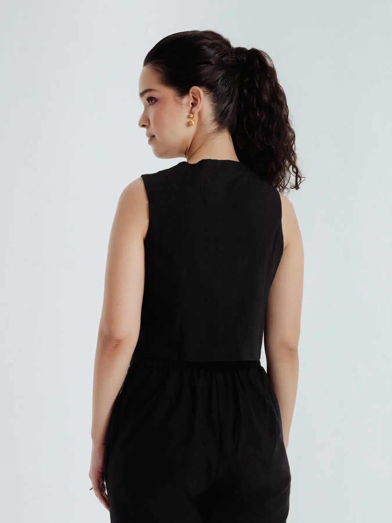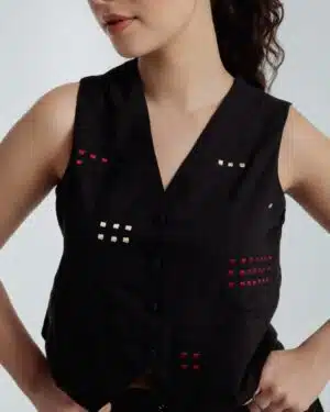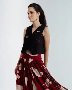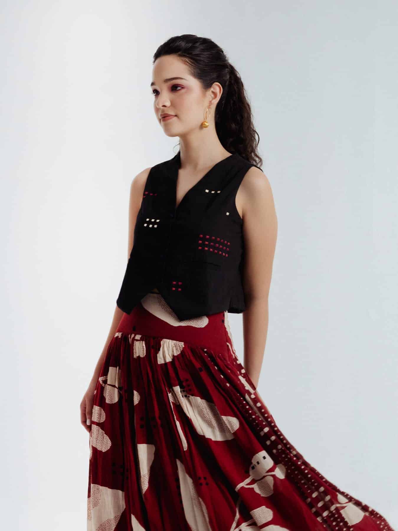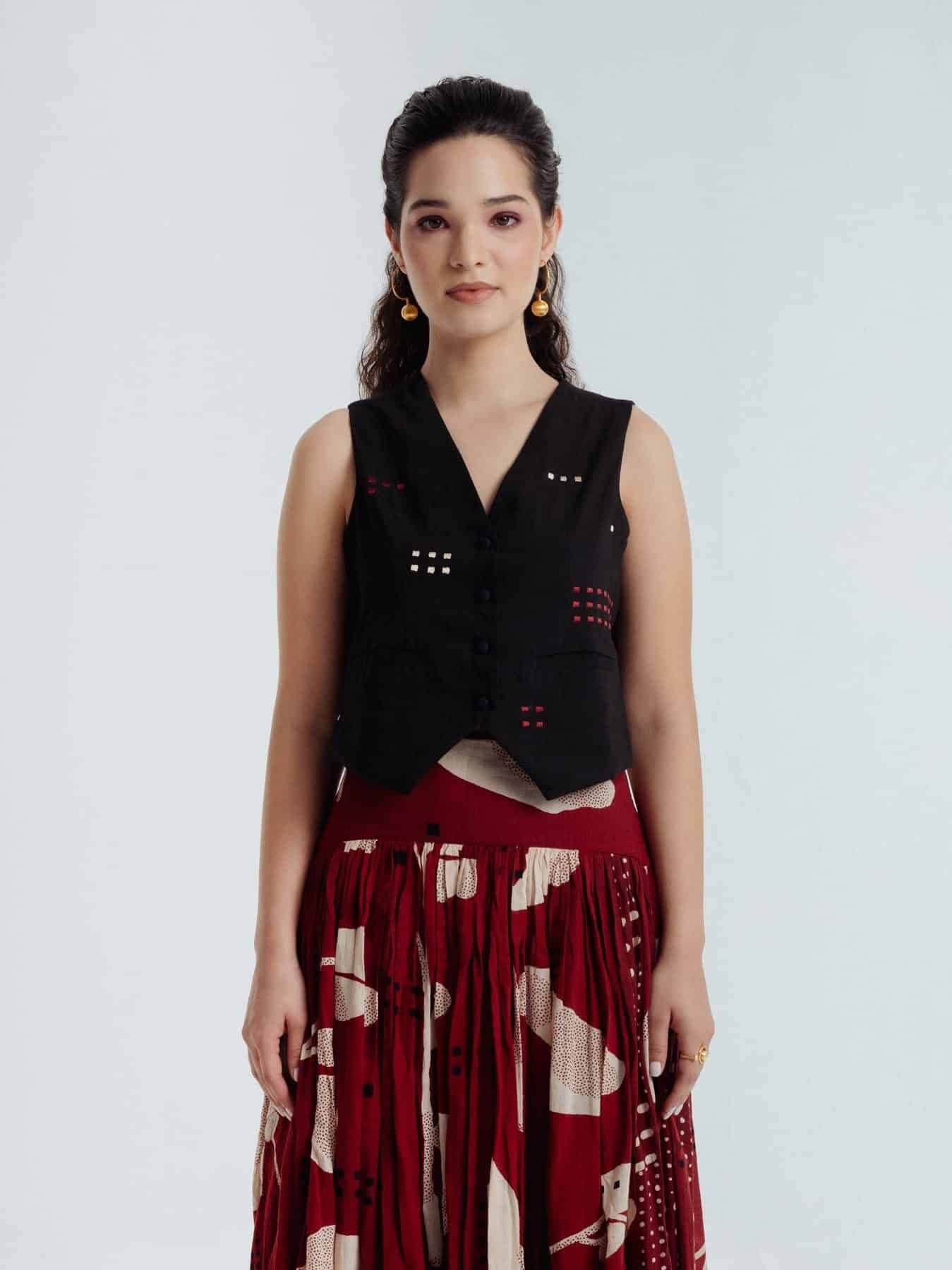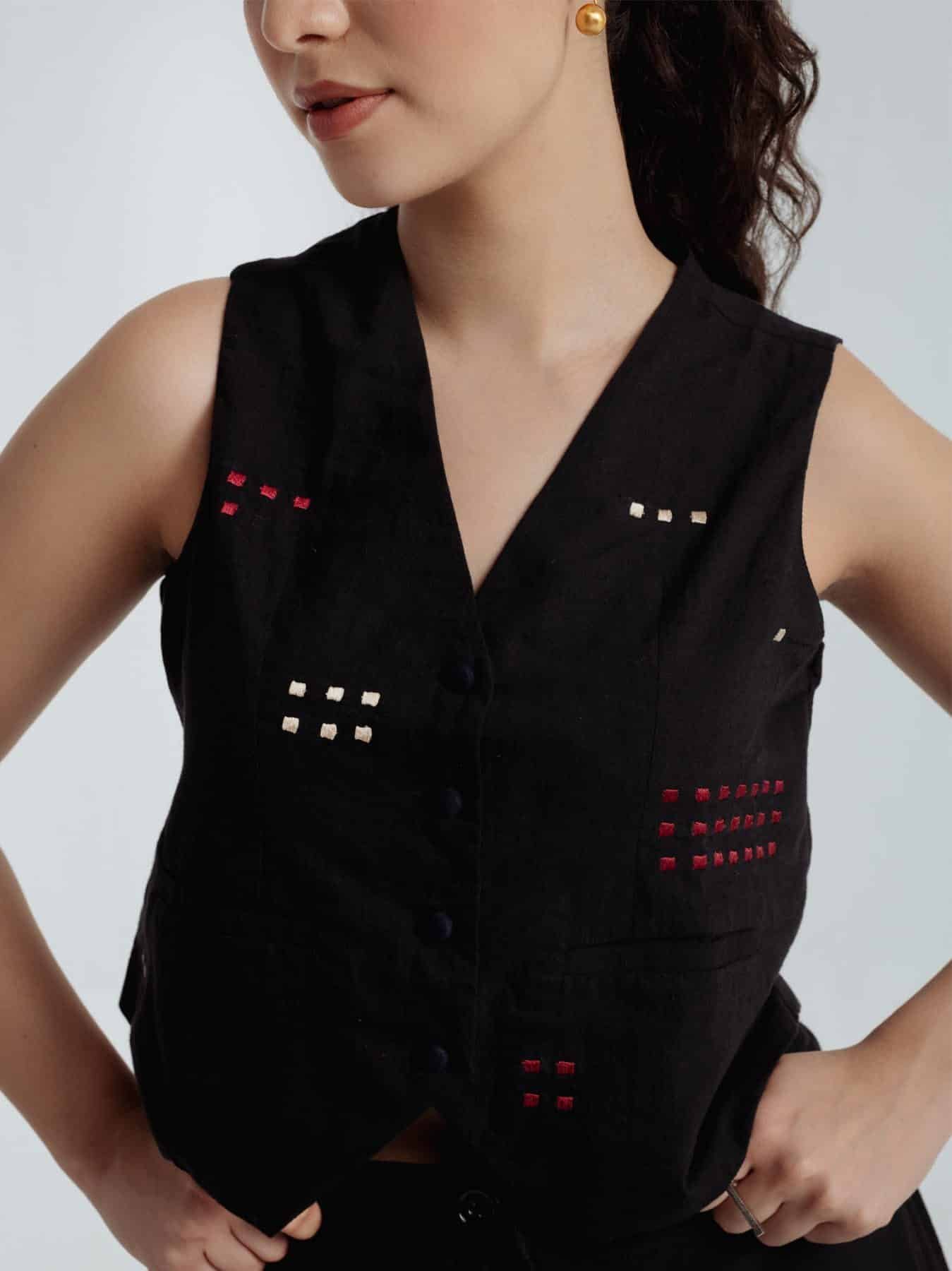 This bohemian black waistcoat showcases delicate embroidery in contrasting red and beige hues that beautifully can complement skirt or pant .Crafted from fine handwoven organic cotton spun in Bengal, it features a lined interior for a crisp, structured fit.Versatile and elegant, this waistcoat pairs effortlessly and can be styled with various pieces from your wardrobe.Waistcoat length 17 inchesModel height is 5"7 wearing S