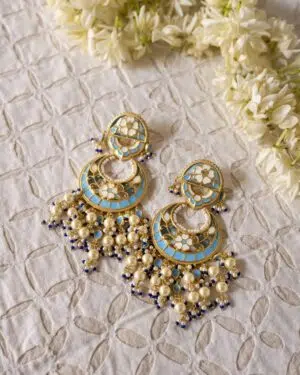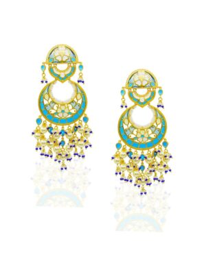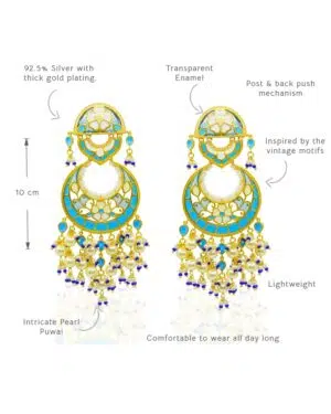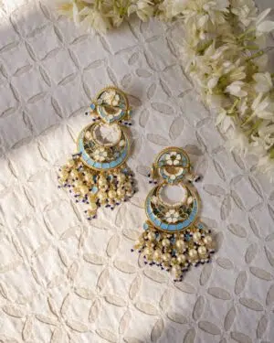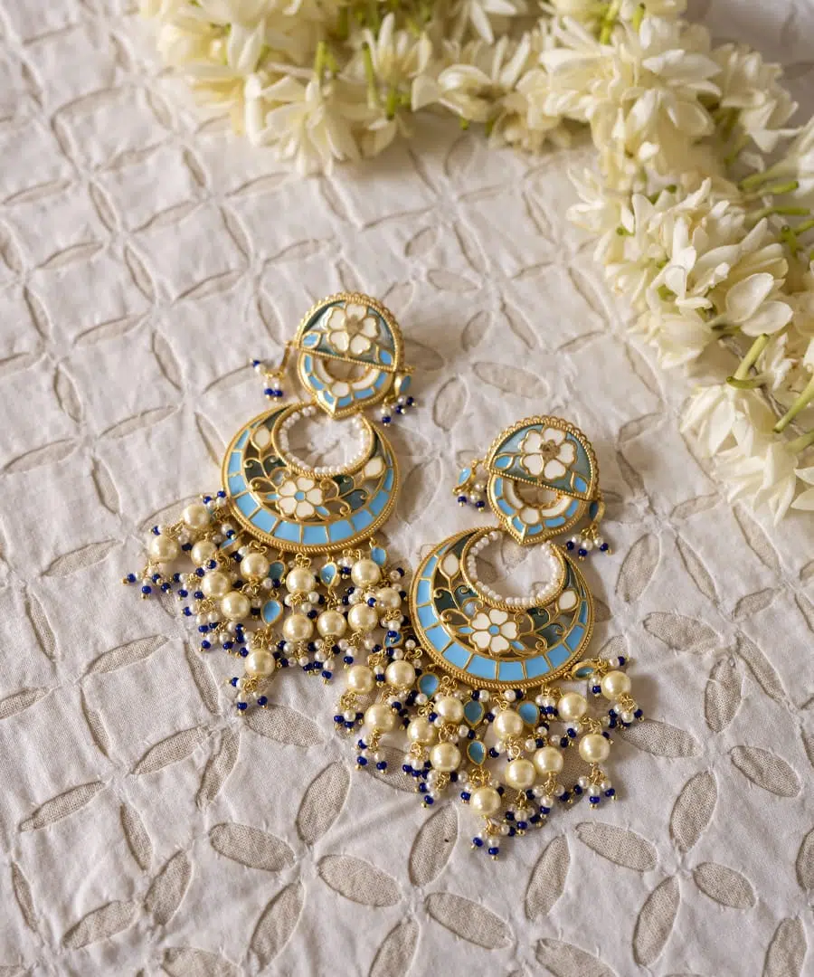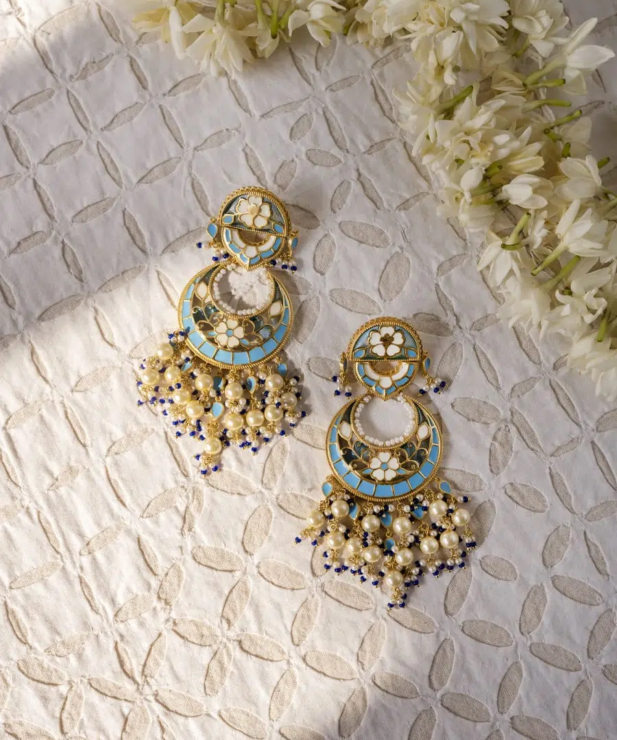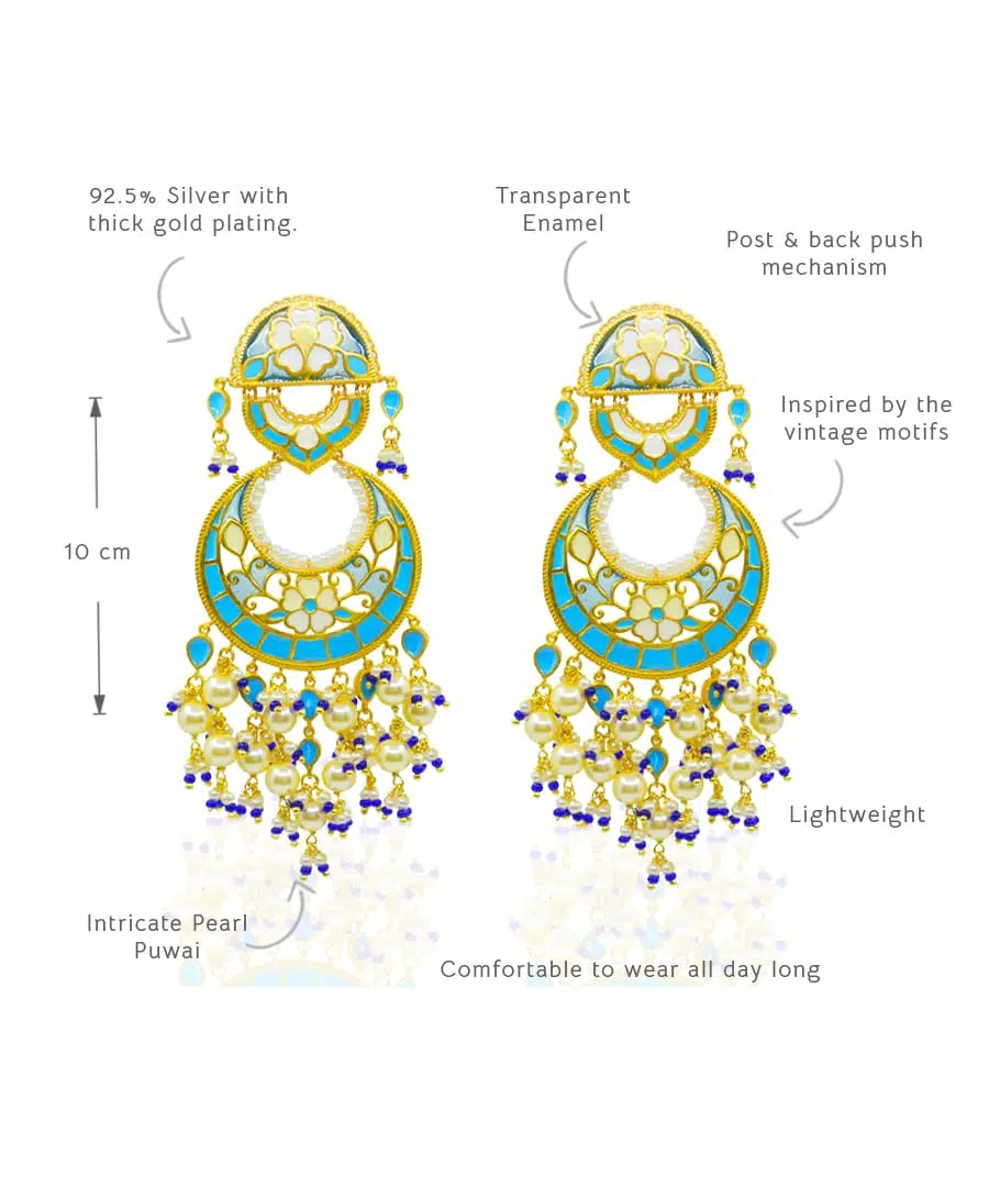 More than just jewelry, these Chandbali earrings are a memory to wear. Handcrafted from 925 sterling silver with a luxurious gold plating, they feature intricate enamel work in soft blue, ivory, and gold.