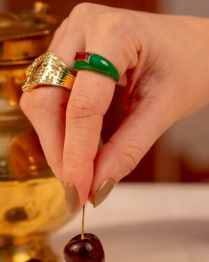 Experience the enchantment of the Garnet Forest Ring, where vibrant green enameling envelops your finger like a lush, ve