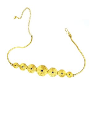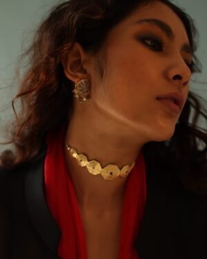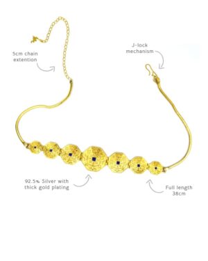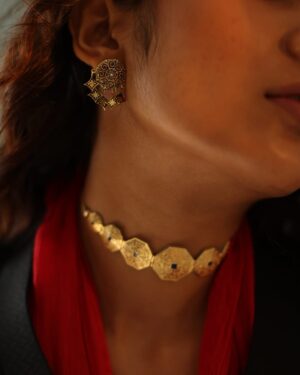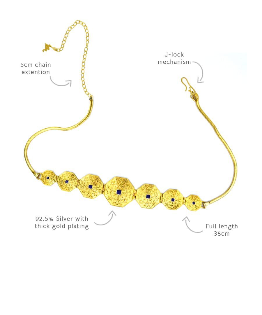 The Gaur kanthi choker is exudes charm and strength in equal measures. The graduating size of the central motif looks very gracefiul on the neck. This choker is handcrafted in 92.5% silver, with thick gold plating, the chain at back has a fish hook clasp and adjustable rings for a perfect fit., Plating: Gold Plated, Metal Type: 92.5% Sterling Silver, Enamel / plating / gemstone: Gold oxidised, Lock Mechanism: J-Lock , Measurement cm : Full length 40 cm, Measurement inches: Full length 15.50 inch, Care Instruction: Keep away from water, perfume and other liquids. Do not use any cleaning agents. Clean when storing in the provided pouches. Store them in moisture free areas and keep them away from water and liquid fragrances.