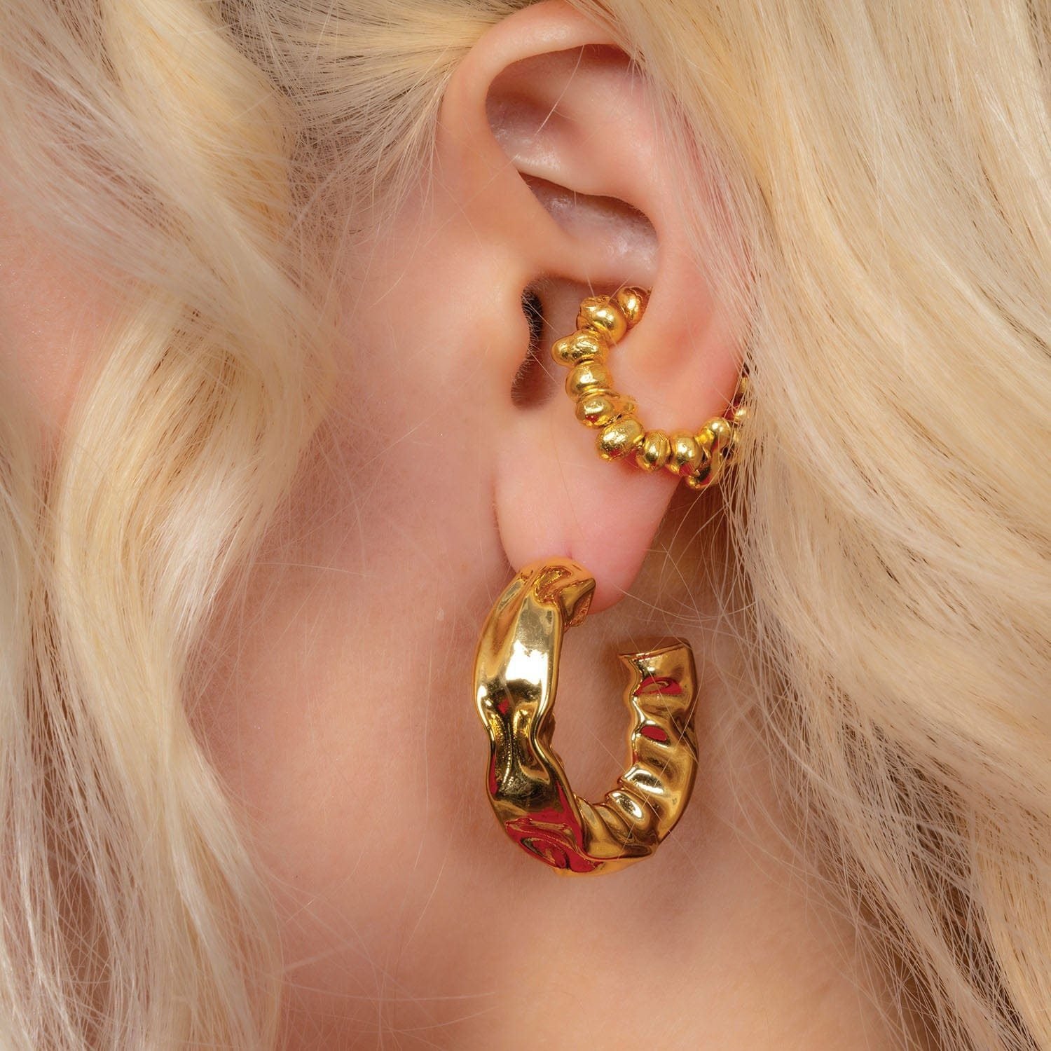 Timeless Elegance Meets Modern TextureDiscover the perfect blend of artisanal craftsmanship and contemporary design. Our Gold Foil Textured Hoops are meticulously crafted for the woman who appreciates subtle luxury. The unique hammered surface catches the light from every angle, providing a radiant glow that complements any skin tone.Premium Quality & DurabilityUnlike standard fashion jewelry, these earrings feature a thick 22KT real gold plating over a high-quality brass alloy base. This ensures a long-lasting, deep gold luster that resists tarnishing. 100% lead and nickel-free, they are designed specifically for all-day comfort and sensitive skin.Key Features:Material: Premium Brass Alloy with 22KT Real Gold Plating.Finish: Hand-hammered "Gold Foil" texture for an organic, artisanal look.Size: Small, versatile diameter ideal for both women and girls.Closure: Secure click-top/hinged backing for effortless wear.Hypoallergenic: Skin-friendly materials that won't cause irritation.Style Tip:Pair these small gold hoops with a crisp white shirt for a professional office look, or layer them