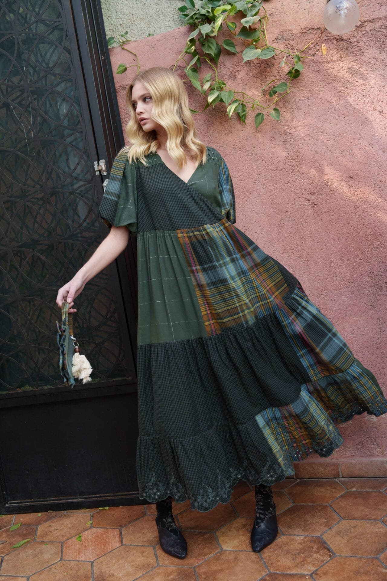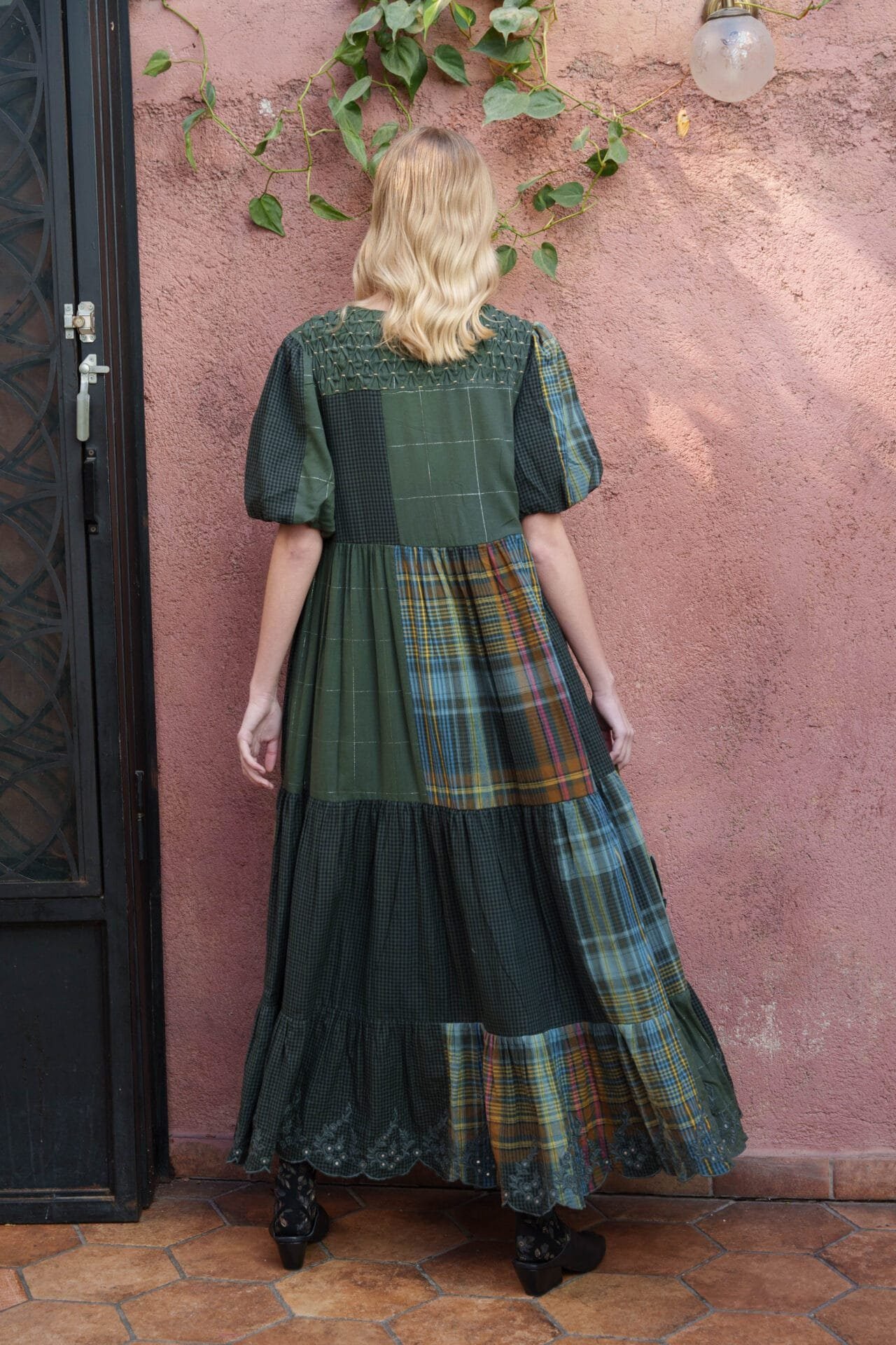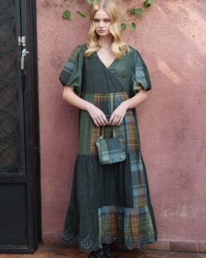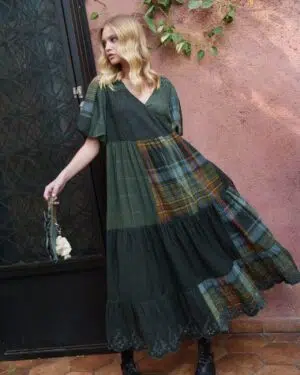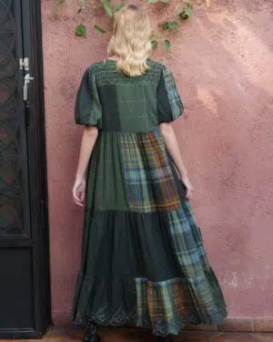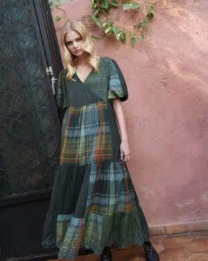 Green cotton checks overlapping tiered midi with smoking yoke