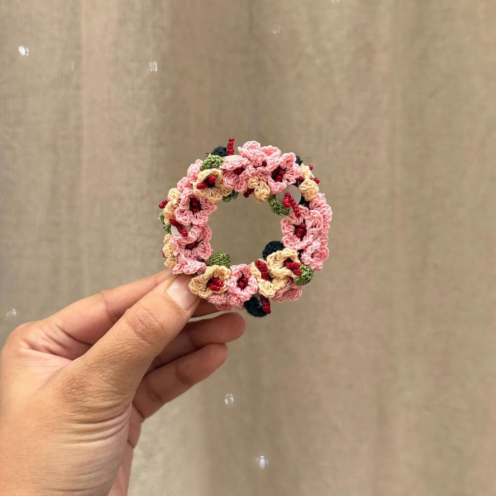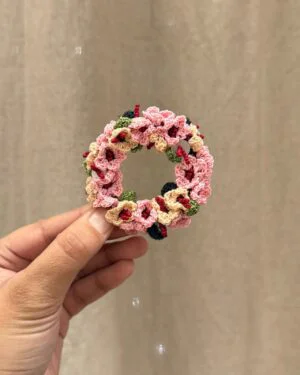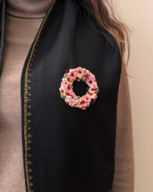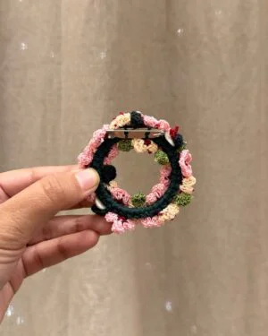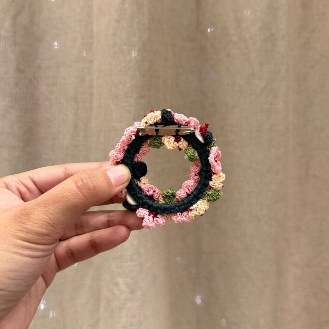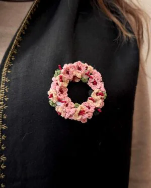 Soft pink and peach daisies come together in this delicately handcrafted brooch, creating a gentle play of colour and texture. Tiny, fine crochet daisies are detailed with maroon seed beads at the centre, paired with crochet leaves and finished with delicate shell button accents for added depth and charm. All elements are carefully stitched onto a sturdy metal ring base, with a metal pin at the back for effortless wear.