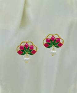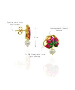 These Gul half earrings are handcrafted in 92.5% sterling silver, with thick gold plating. These earrings has a transparent enamel details in vibrant colors with flower motif design and hanging pearl. These earrings has post and push back mechanism for easy wear., Plating: Gold Plated, Metal Type: 92.5% Sterling Silver, Enamel / plating / gemstone: Transparent Enamel, Lock Mechanism: Post and push back, Measurement cm : Length - 3 cm / width - 2.5 cm OR , Measurement inches: Length - 1.18 inch / width - 0.98 inch, Care Instruction: Keep away from water, perfume and other liquids. Do not use any cleaning agents. Clean when storing in the provided pouches. Store them in moisture free areas and keep them away from water and liquid fragrances.