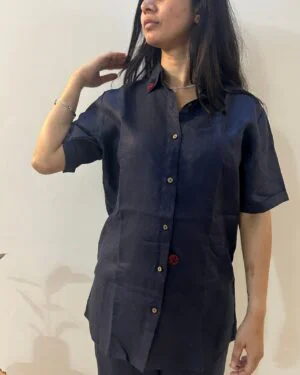 Design: Front placket with wooden buttons, shirt collar, and 1/4th sleeves