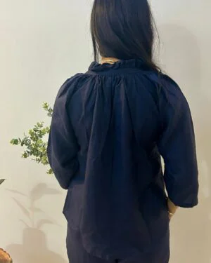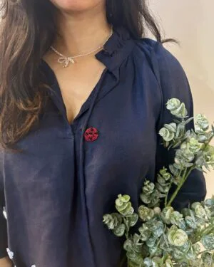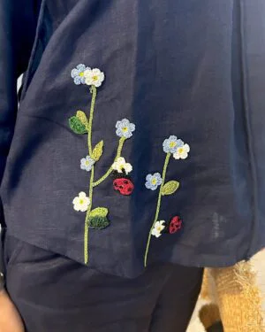 Embrace elegance with the Indigo Serene Stitch Linen Top. Crafted from premium linen, this top features a round neck with gathered details and a string for a refined look. The 3/4th sleeves are adorned with intricate crochet flowers, leaves, and a ladybug, adding a touch of artisanal charm.
