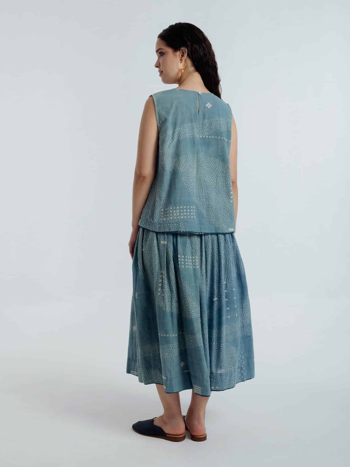 This exquisite set is adorned with Bagru’s traditional Dabbu mud-resist prints and embellished with delicate, intricate embroidery, a harmonious blend of artistry and elegance. The relaxed silhouette drapes with effortless grace, flattering the figure while providing all-day comfort.Blue and white french knots, hand-embroidered into dots and lines, form subtle organic motifs, adding a quiet, poetic charm. Bold Dabbu patterns create depth and are thoughtfully placed. Designed to move with you, this set feels as uplifting as it looks, a piece that carries lightness and evokes joy with every wear.Versatile and timeless, Fayra is an everyday essential that pairs beautifully with a wide range of outfits in your wardrobe.Garment length:Top – 21" | Skirt – 32"Model height: 5’7" (wearing size S)