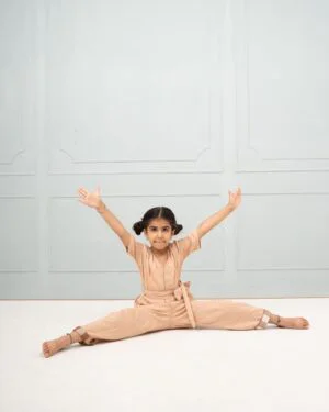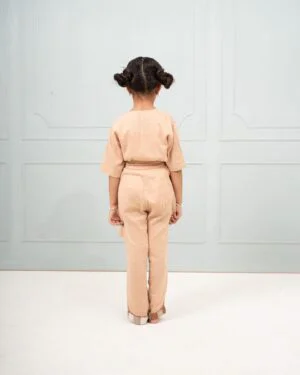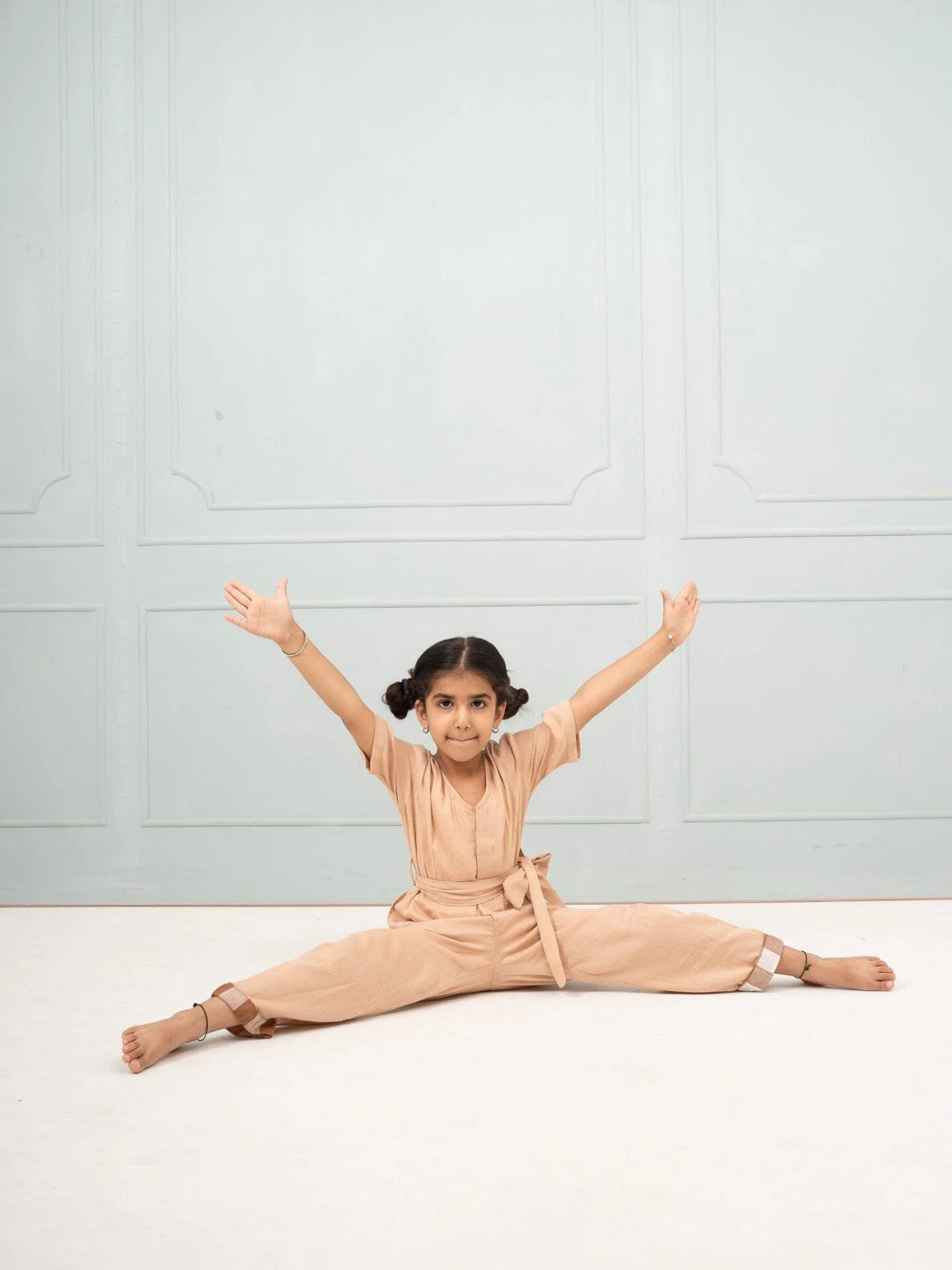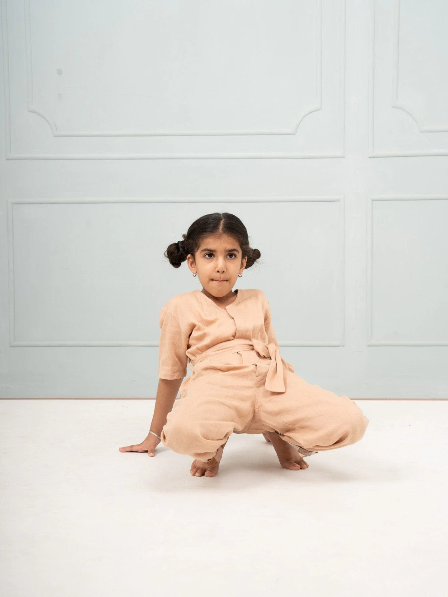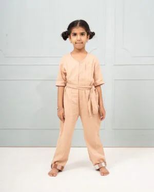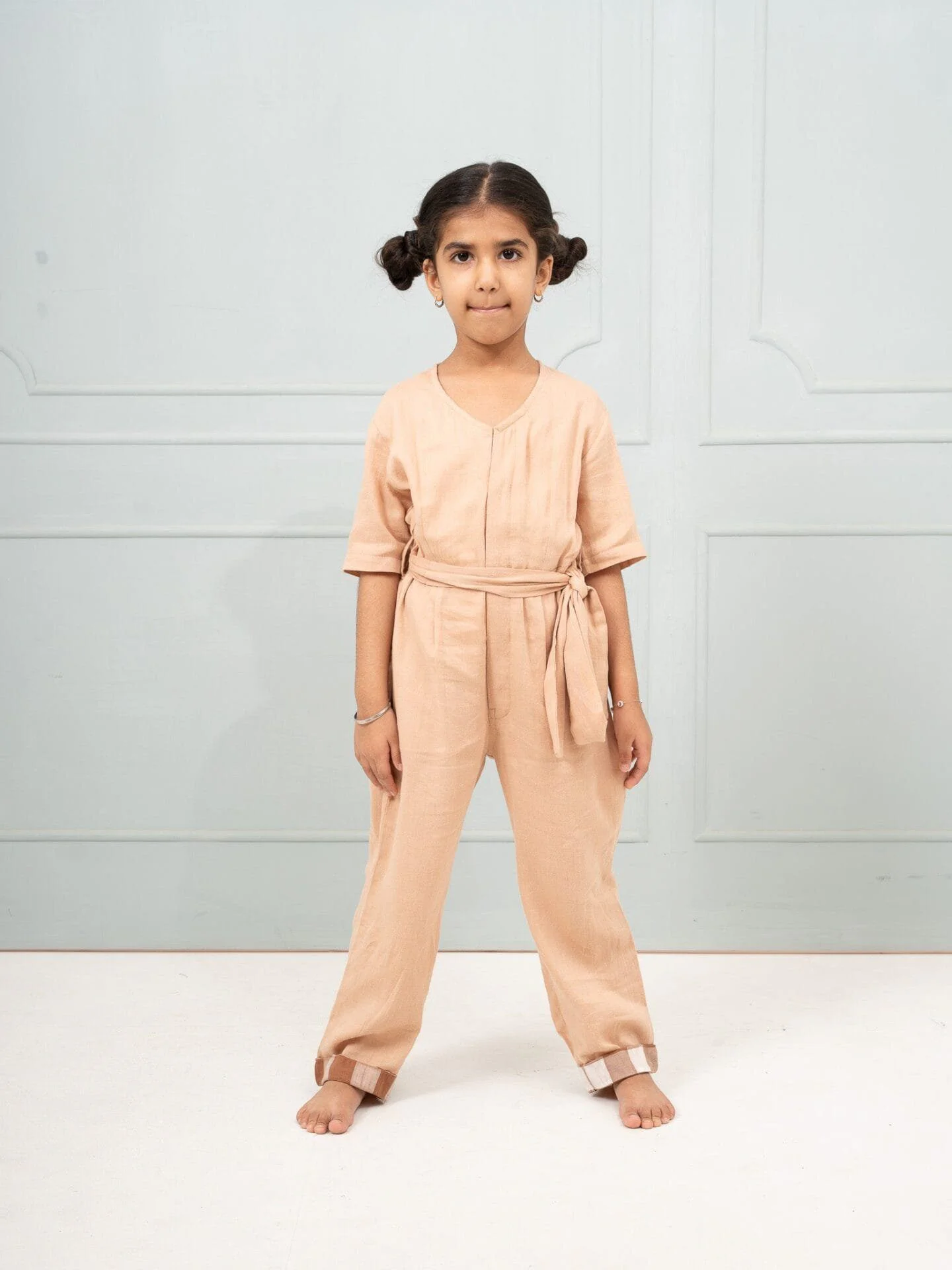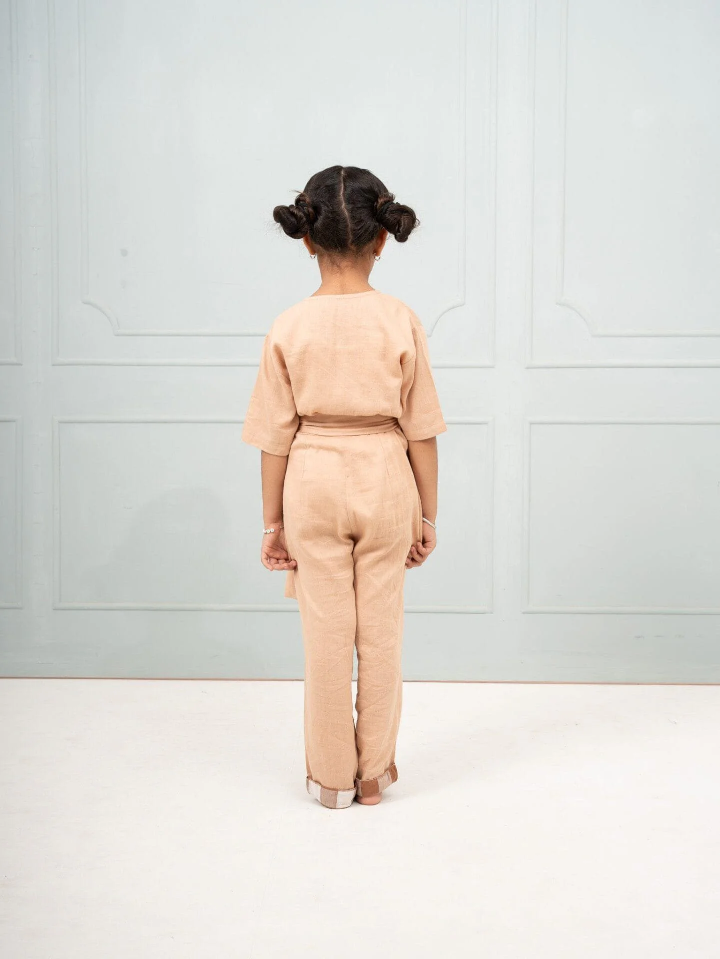 This V-neck jumpsuit in golden wheat tones is finished with a tie belt, roomy side pockets, and pop-up color button roll