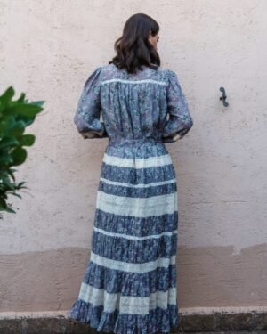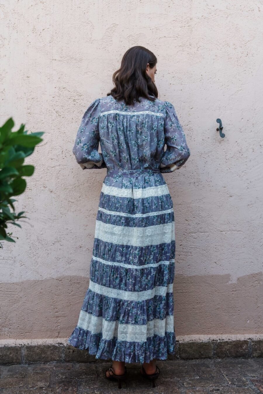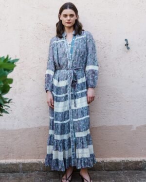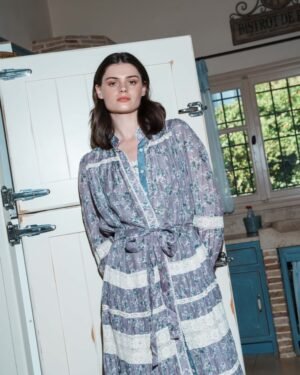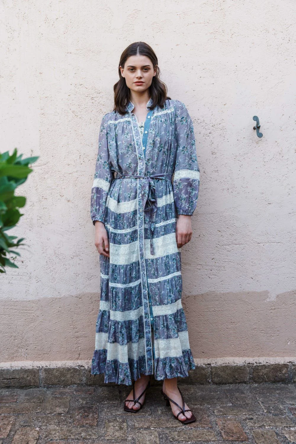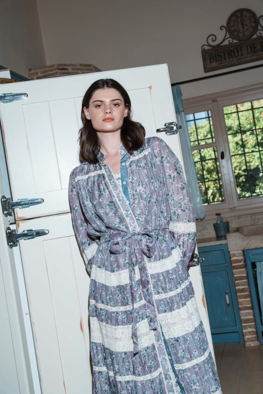 Crafted in fine fabric, this Lilac floral printed with lace insert front open dress with tie up belt showcases Pinnacle by Shruti Sancheti?s timeless craftsmanship and feminine grace. A perfect piece for effortless day-to-evening elegance.